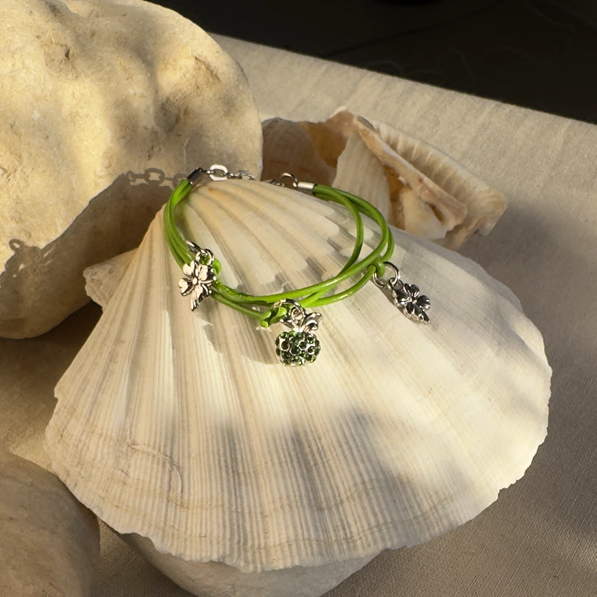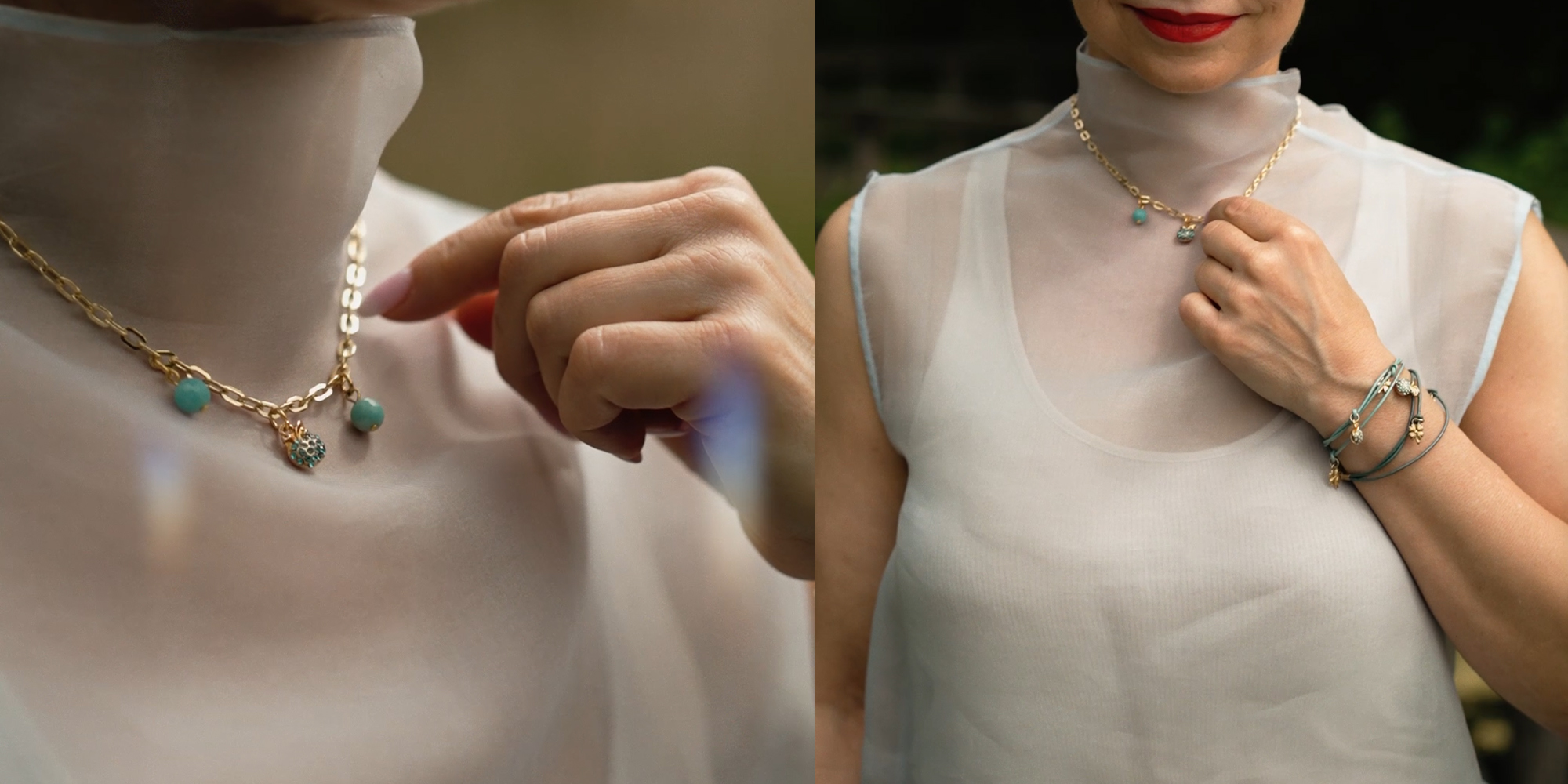 Naszyjniki dopełniają naturalne kamienie, a bransoletki zdobią zawieszki-koniczynki — drobny symbol szczęścia, który możesz mieć zawsze przy sobie.