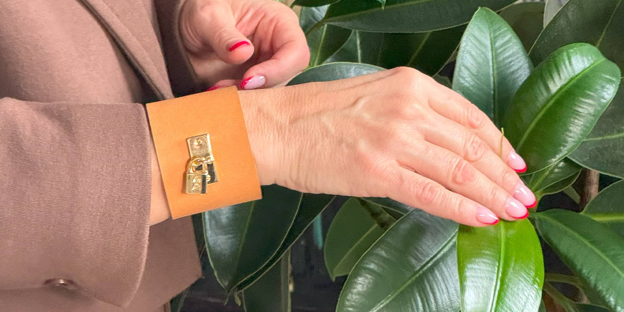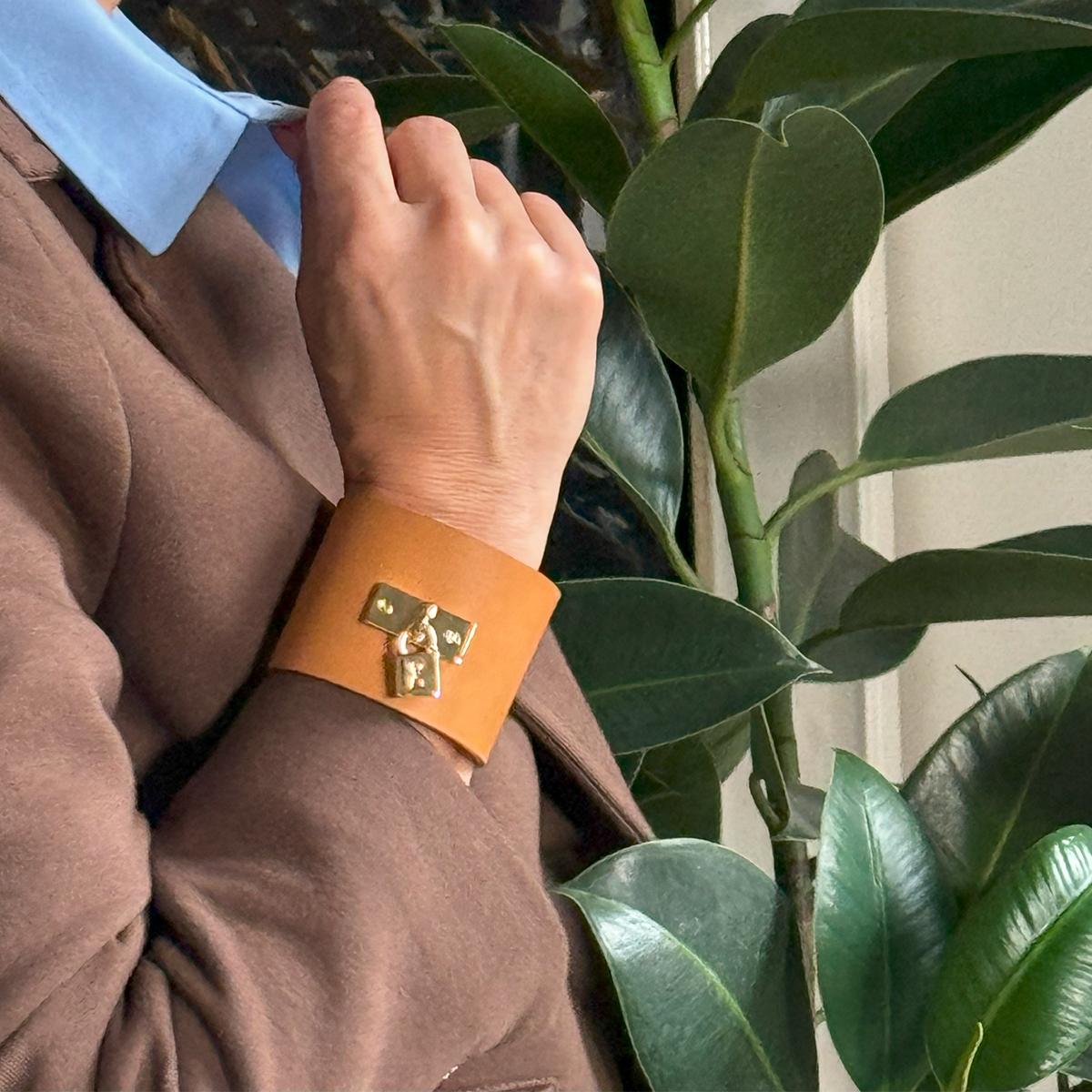Szeroka, wykonana z naturalnej skóry, bransoletka w kolorze kamel przykuwa spojrzenie – jest jak oświadczenie złożone światu.