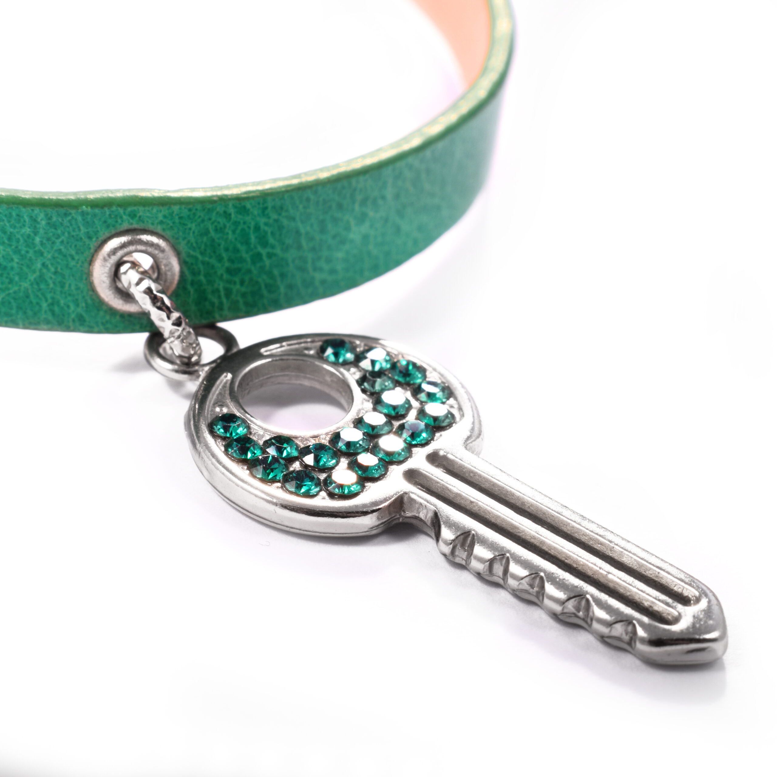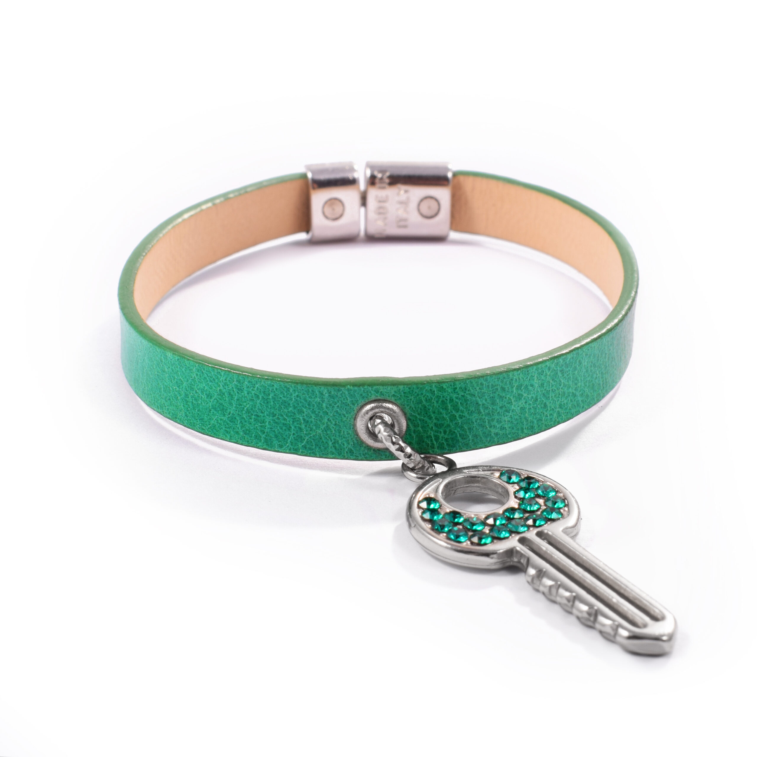Skórzana bransoletka w kolorze klasycznej zieleni, z wyjątkowym, srebrnym kluczykiem wysadzanym dziewiętnastoma kryształami Swarovski.