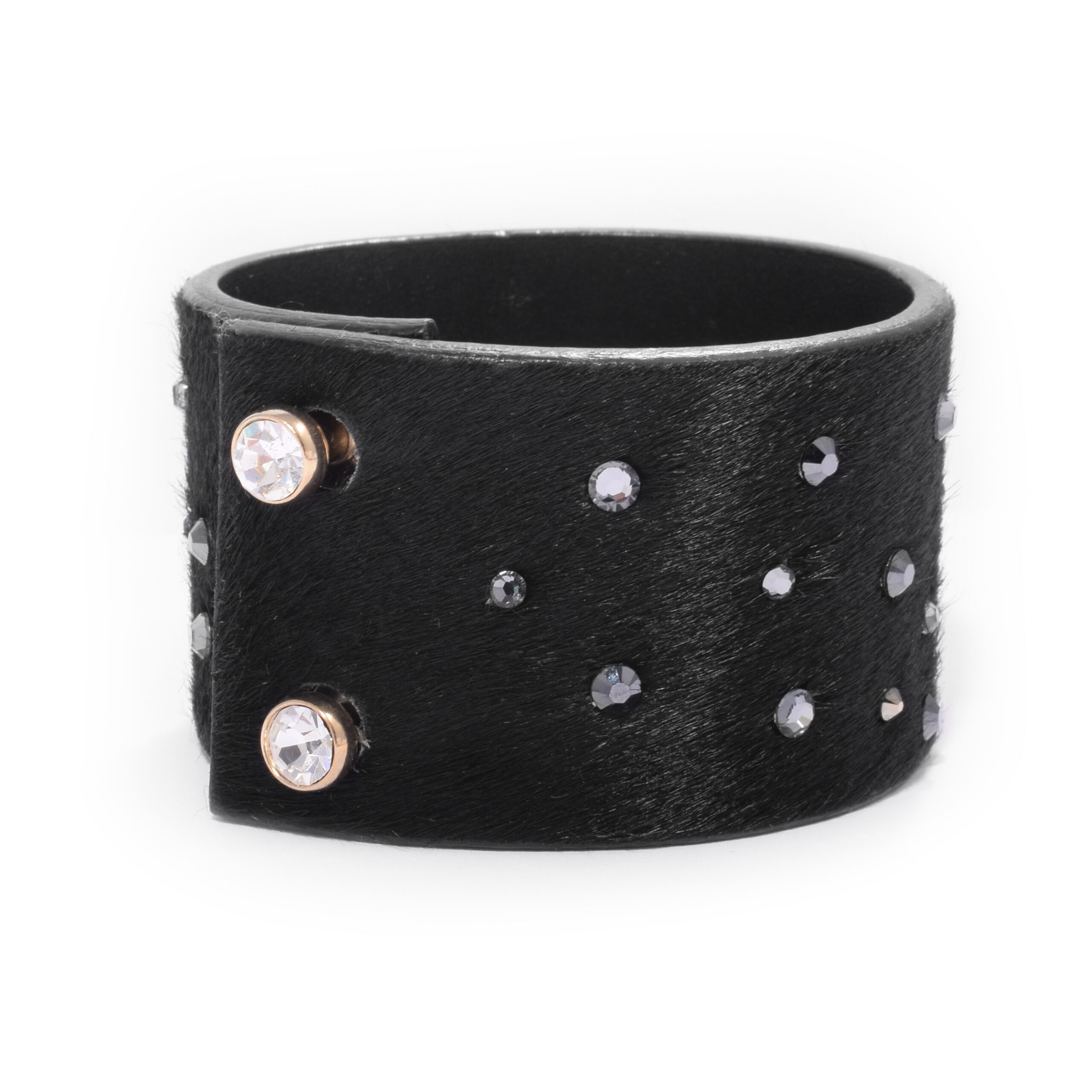 Szeroka czarna bransoletka wykonana ze skóry z włosiem. Czterdzieści drobnych kryształów Swarovski sprawia, że mieni się przy każdym ruchu. Gwoździe do zapinania także wykończono kryształami Svarowski.