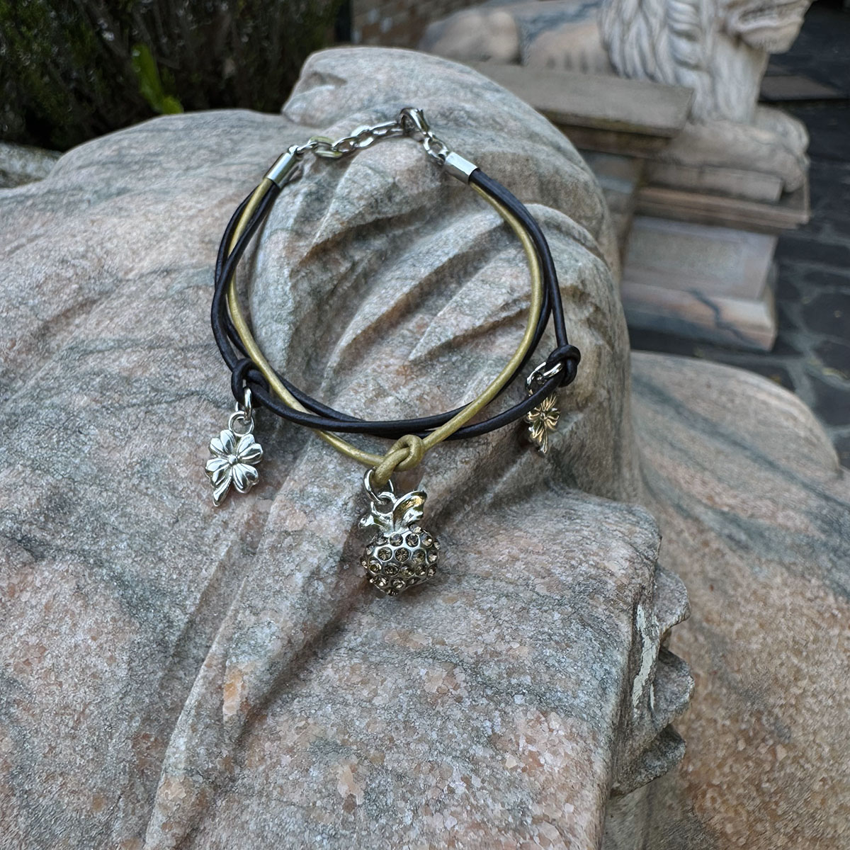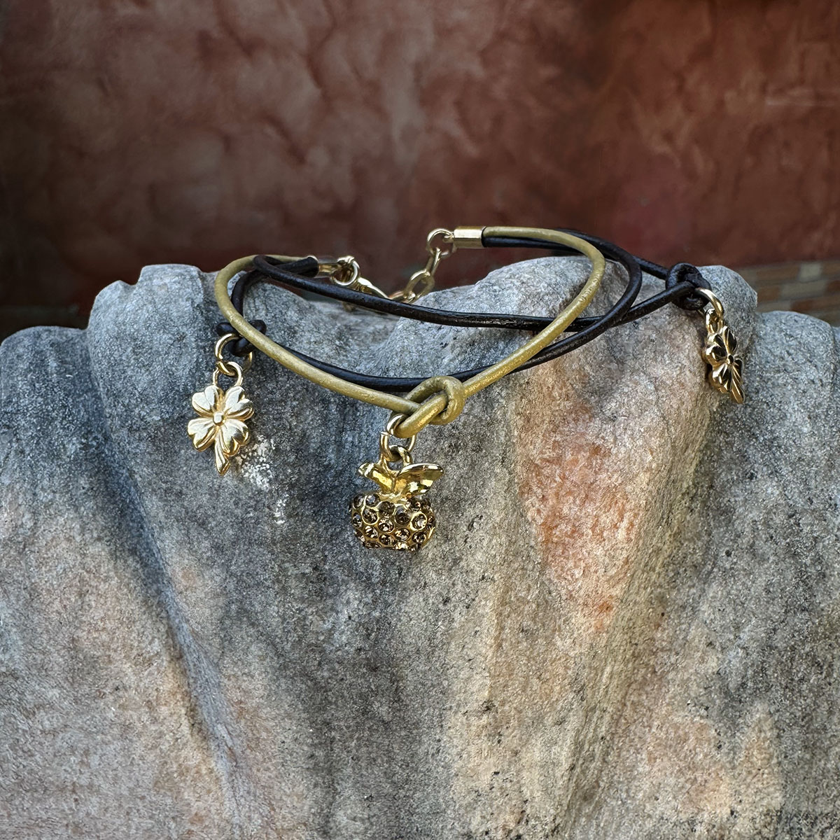 Zestawienie brązu i złota tworzy piękny kontrast, który podkreśla unikalność tej bransoletki. W centrum – srebrne jabłuszko z 23 kryształami Swarovski i dwie urocze koniczynki, które dodają lekkości i energii. Elegancja z odrobiną luzu.