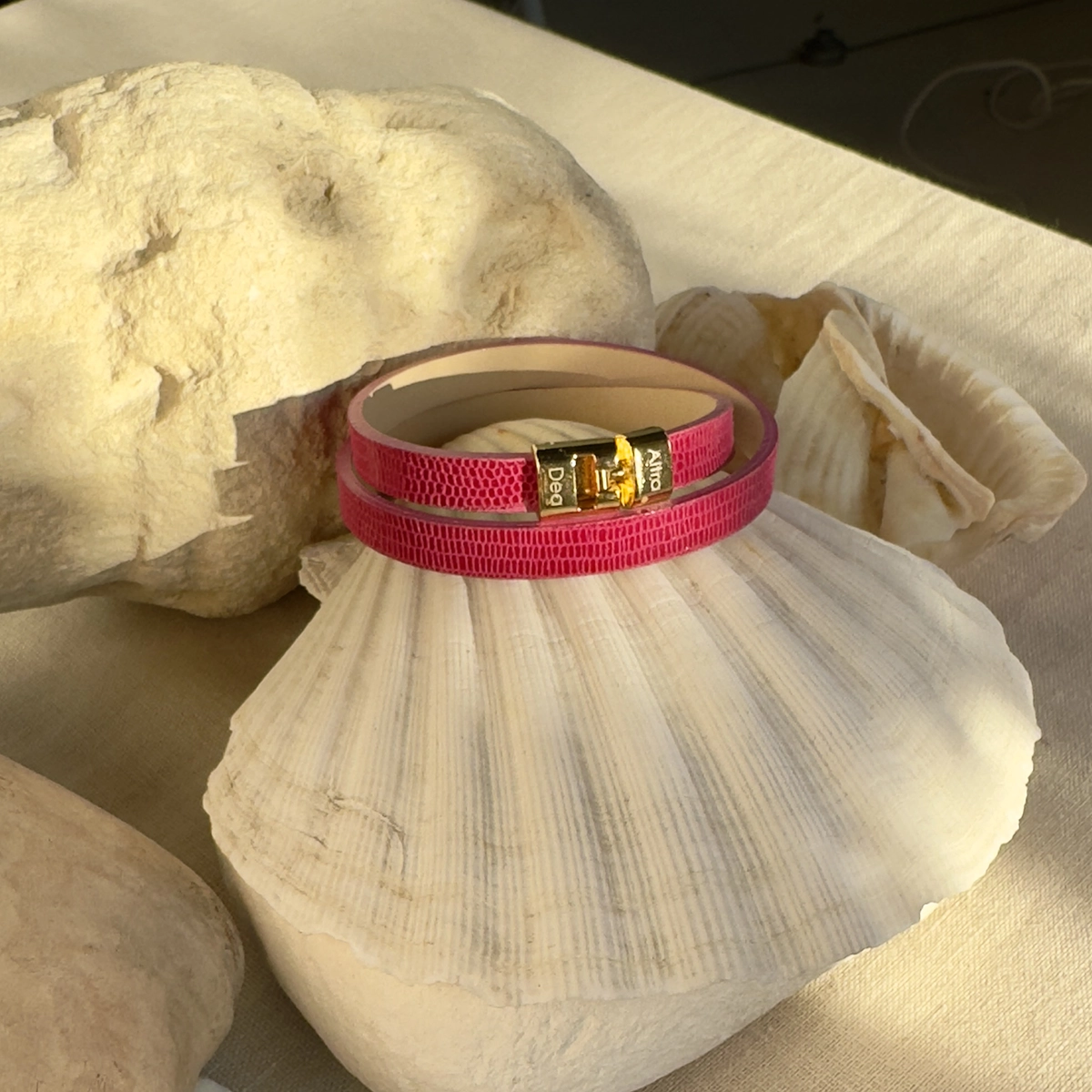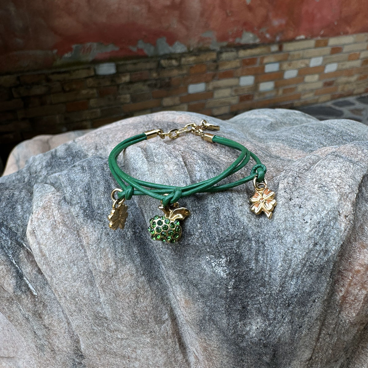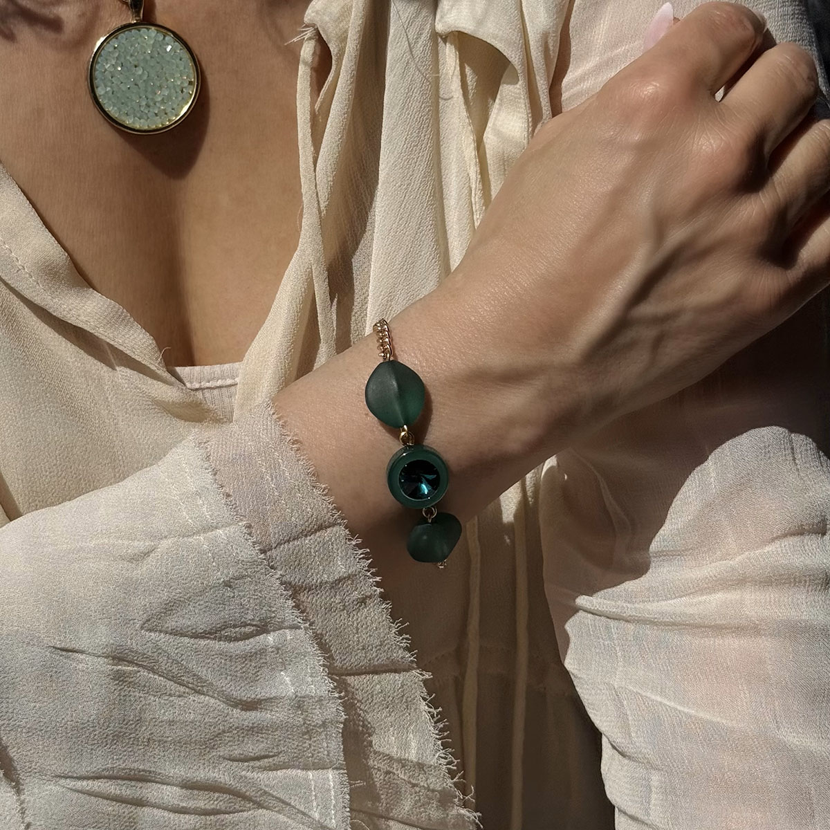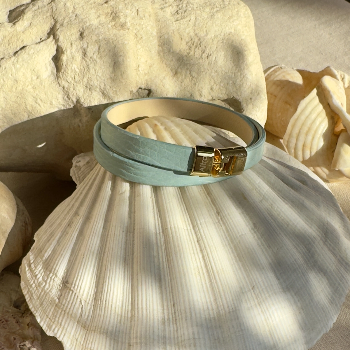 Ciemnozielona bransoletka z zamszowej skóry, podwójnie owijana wokół nadgarstka. Minimalistyczne, złote zapięcie podkreśla jej wyrafinowaną prostotę.