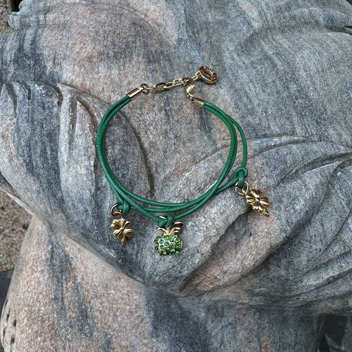 Bransoletka Fruttata – ciemnozielona skórka, złote wykończenie, ciemnozielone kryształy Swarovski