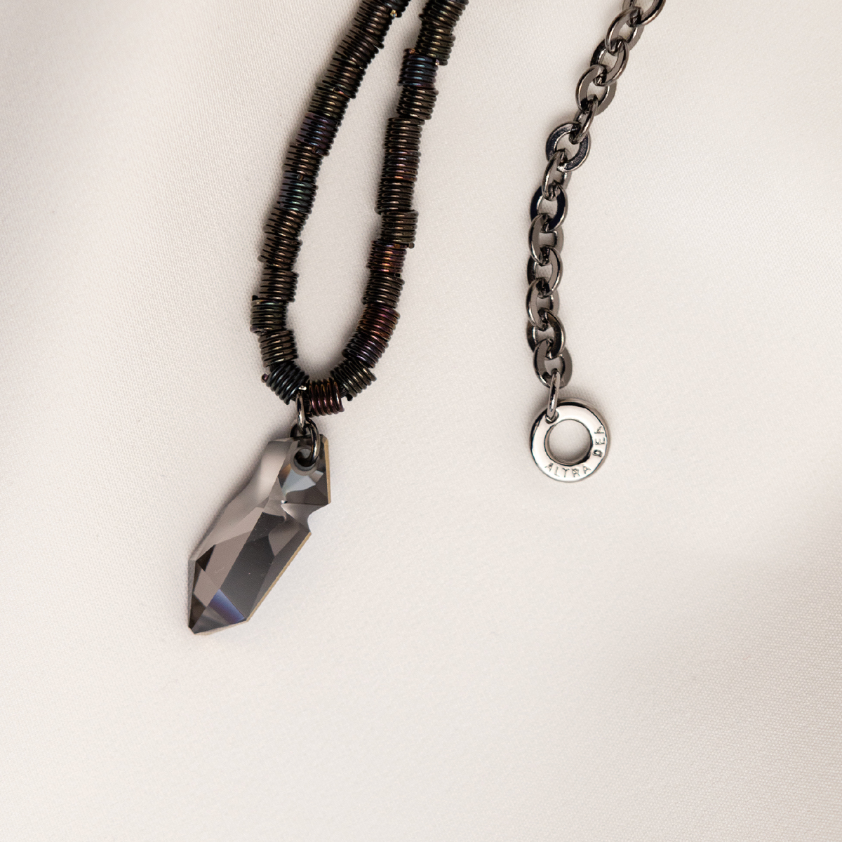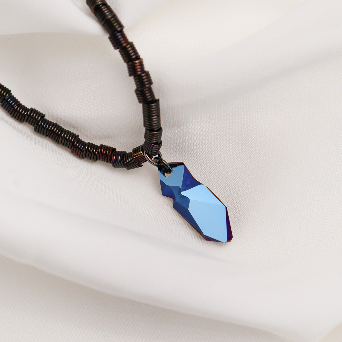 Krótki naszyjnik z zawieszką z granatowego kryształu Swarovski o charakterystycznym nieregularnym szlifie. Kryształ zaprojektował dyktator mody Jean Paul Gaultier. Symbolizuje on odkrywanie piękna w braku doskonałości. Łańcuszek naszyjnika składa się z mosiężnych sprężynek, które razem tworzą nieregularną strukturę. Rewers kryształowego wisiorka w kolorze grafitowym daje możliwość, by naszyjnik nosić dwustronnie.