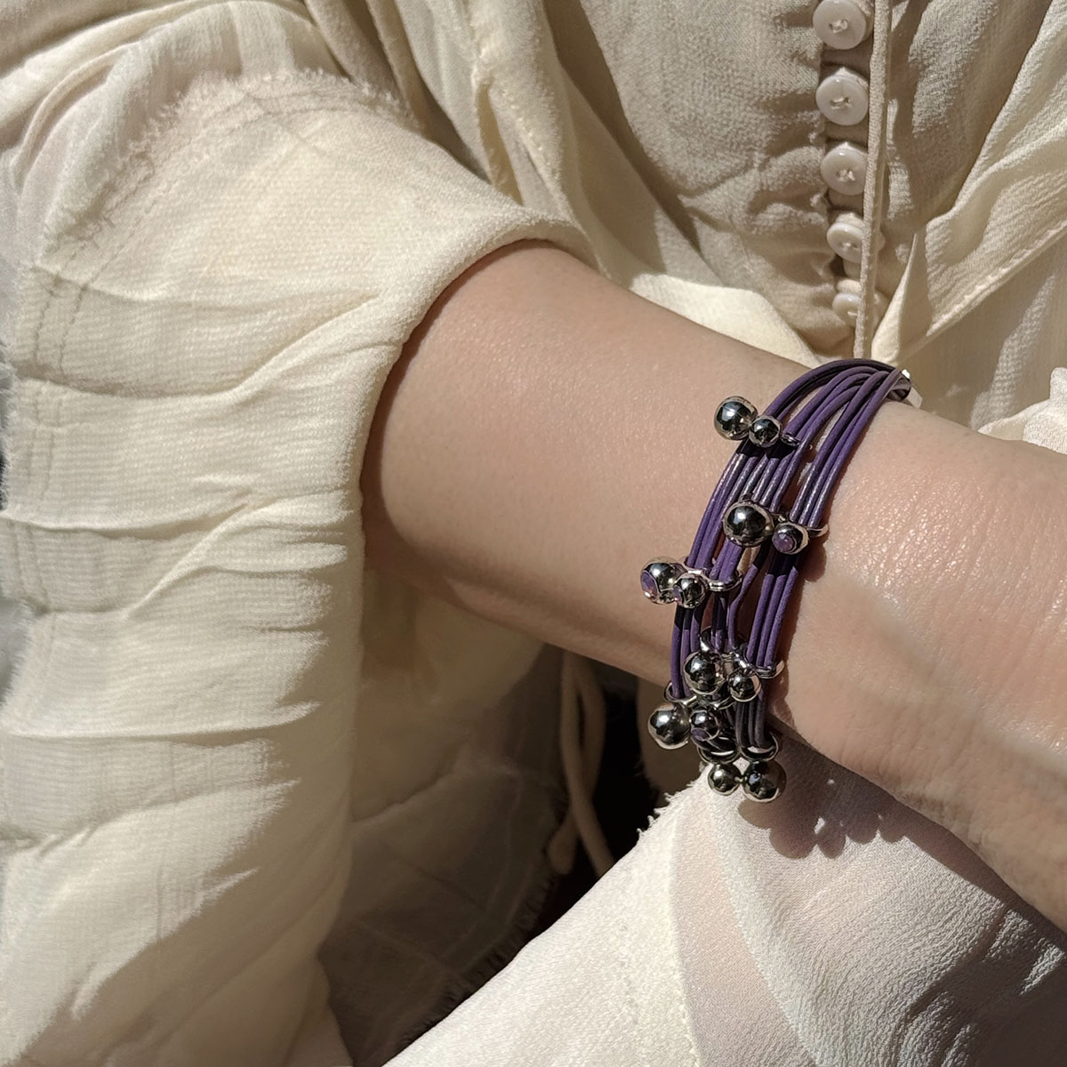 Bransoletka Brio – Fioletowa skórka, srebrne wykończenie, 6 fioletowych kryształów Swarovski