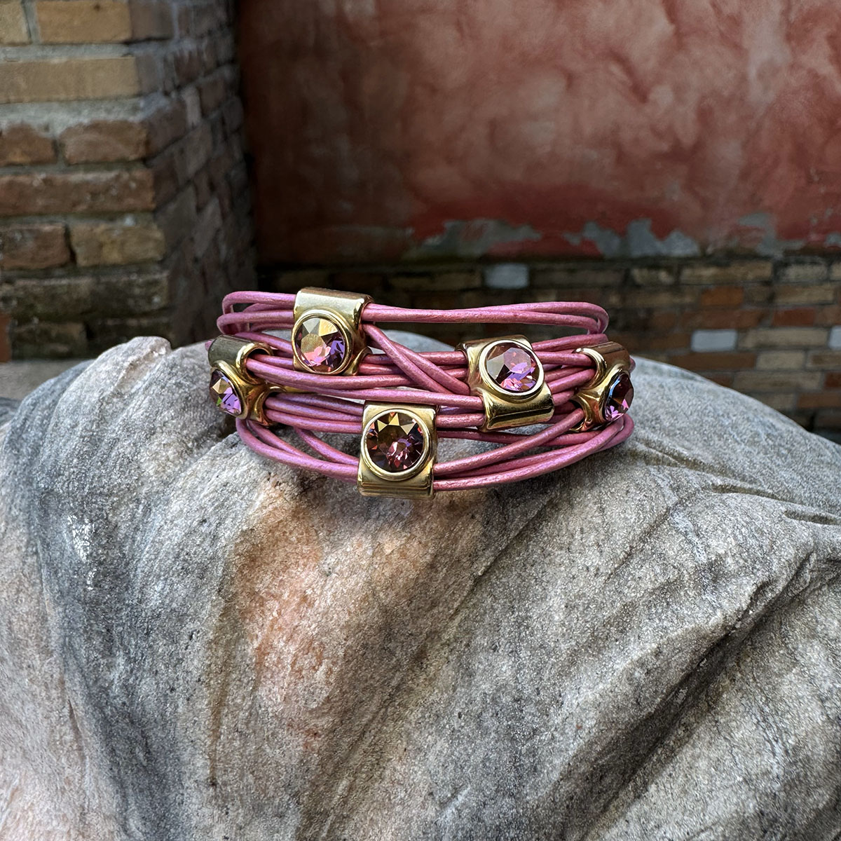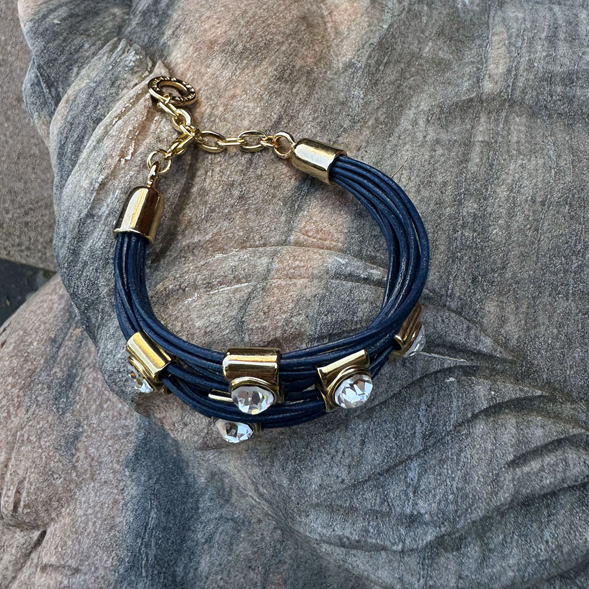 Granatowa Aura ze złotymi akcentami to spokój, siła i pewność siebie. To bransoletka dla kobiet, które wiedzą, czego chcą i noszą to z dumą. Pięć kryształów Swarovskiego przyciąga uwagę, podkreślając moc i klasę, które kryjesz w sobie.