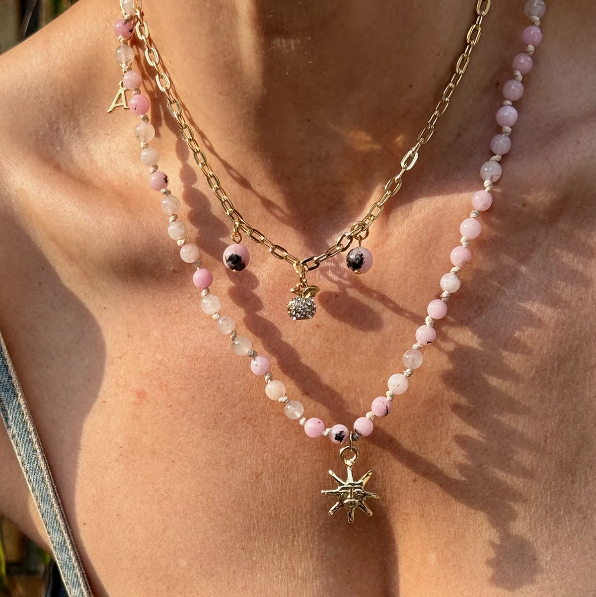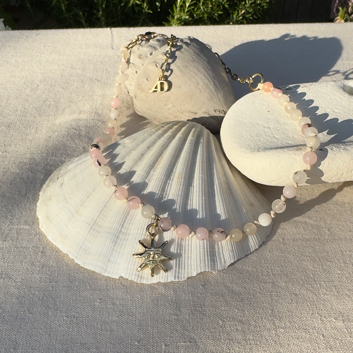 Naszyjnik z kolekcji Rosalina to połączenie delikatności i charakteru. Jasnoróżowe kamienie agatu z subtelnymi czarnymi plamkami nawleczone są na elegancki sznurek, a regulowany łańcuszek umożliwia dopasowanie długości do stylizacji. W centrum naszyjnika znajduje się zawieszka – złote słońce, jeden z najbardziej rozpoznawalnych symboli Altra Dea.