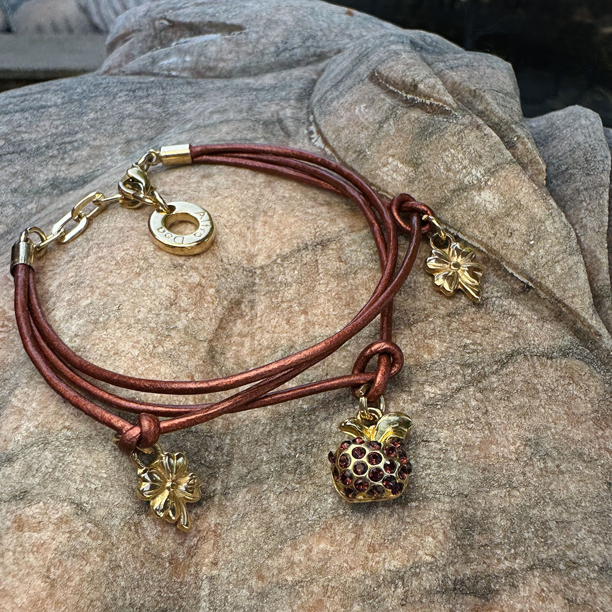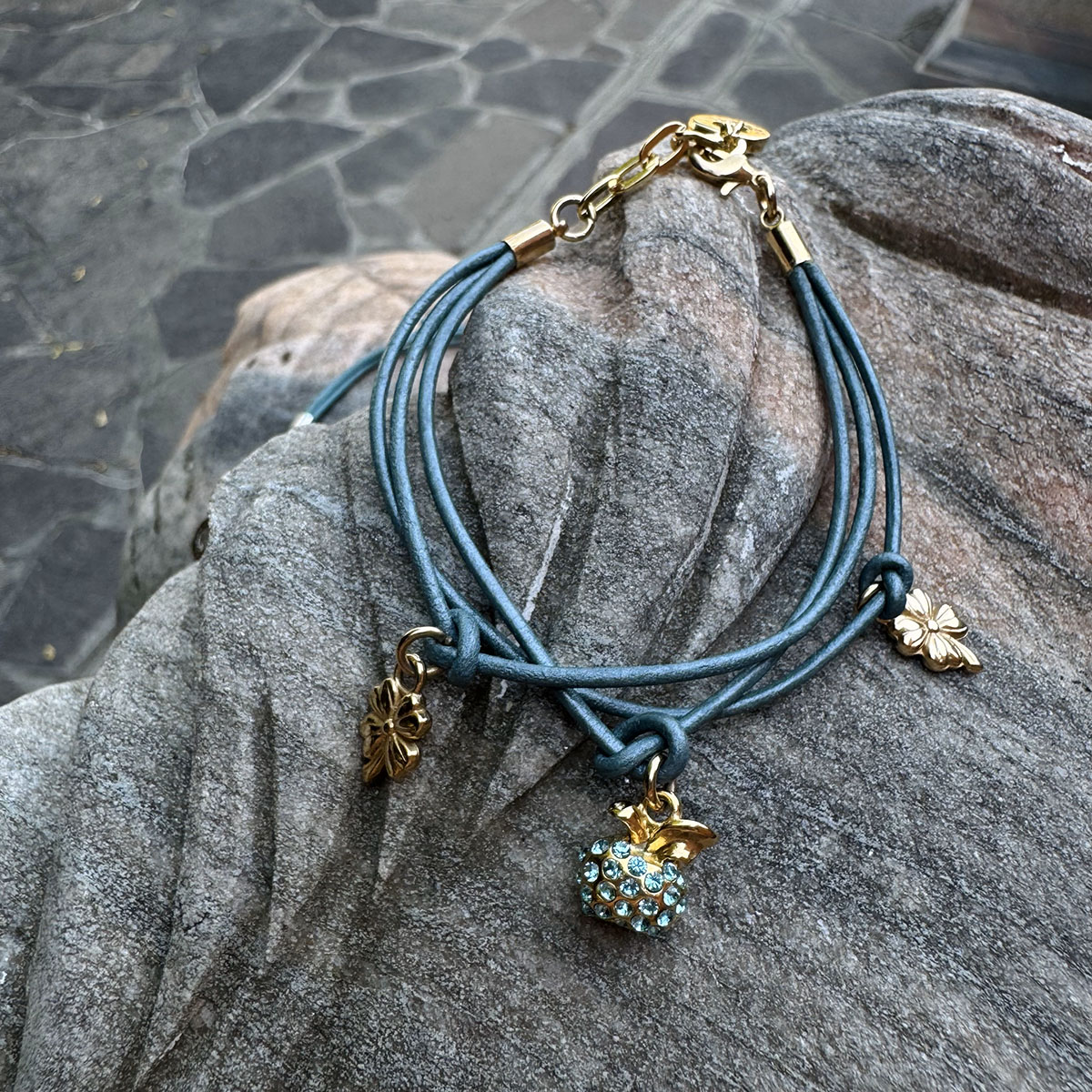 Jak zielone jabłko na letnim targu – świeża, radosna, przyciągająca wzrok. Złote wykończenie i jasnozielone kryształy Swarovski łączą się w zawieszce-jabłuszku z 23 kamieniami, obok której tańczą dwie koniczynki. Bransoletka, która wywołuje uśmiech.
