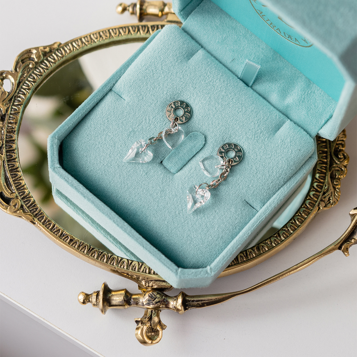Kolczyki Amore w wersji srebrnej to połączenie lekkości, elegancji i nowoczesnej formy. Dwa kryształy Swarovski w kształcie serca zawieszone na delikatnej konstrukcji pięknie poruszają się przy każdym ruchu.