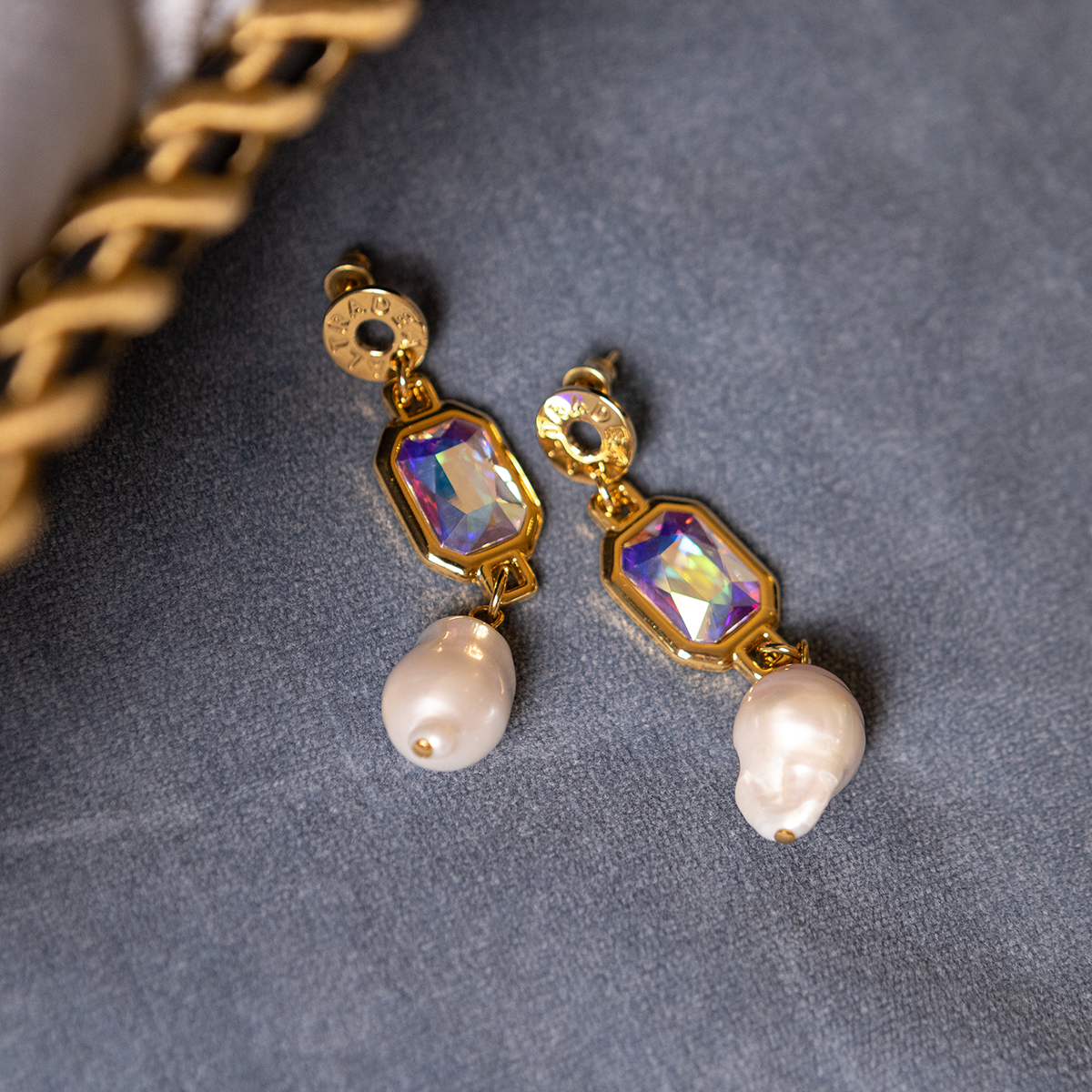 Te kolczyki z kolekcji Aria łączą w sobie blask kryształu Swarovski Aurora Boreale z miękkością naturalnej perły hodowlanej o nieregularnym kształcie.