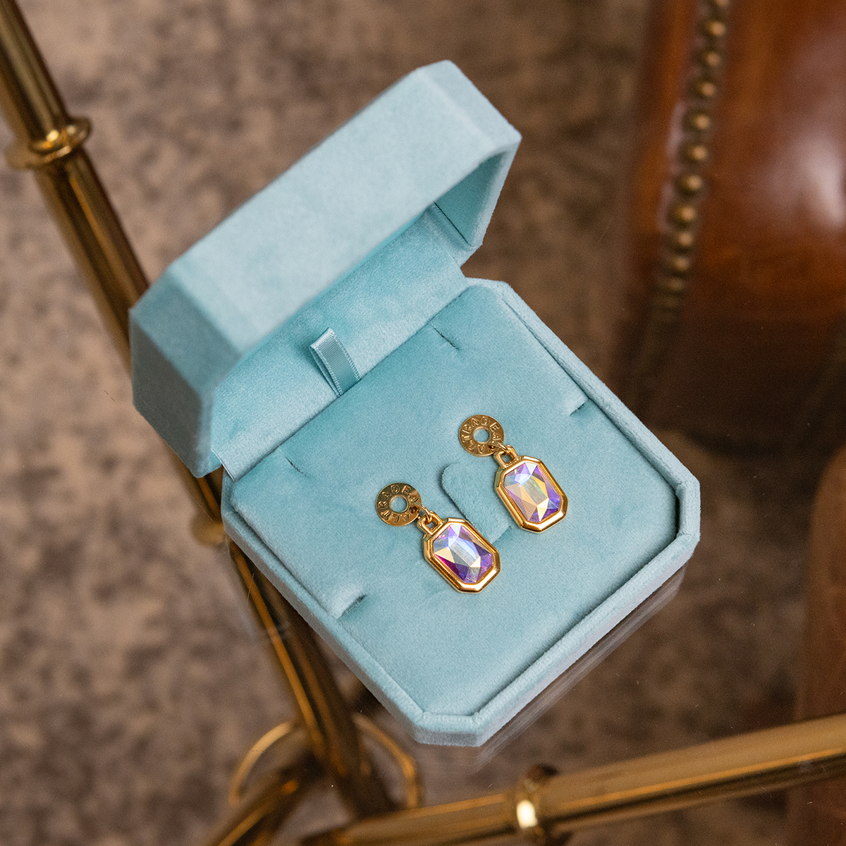 Kolczyki Aria Grande zdobi duży kryształ Swarovski Aurora Boreale, który w złotej oprawie tworzy ciepły, świetlisty efekt. Model pięknie rozświetla twarz i podkreśla jej rysy, dodając elegancji każdej stylizacji.