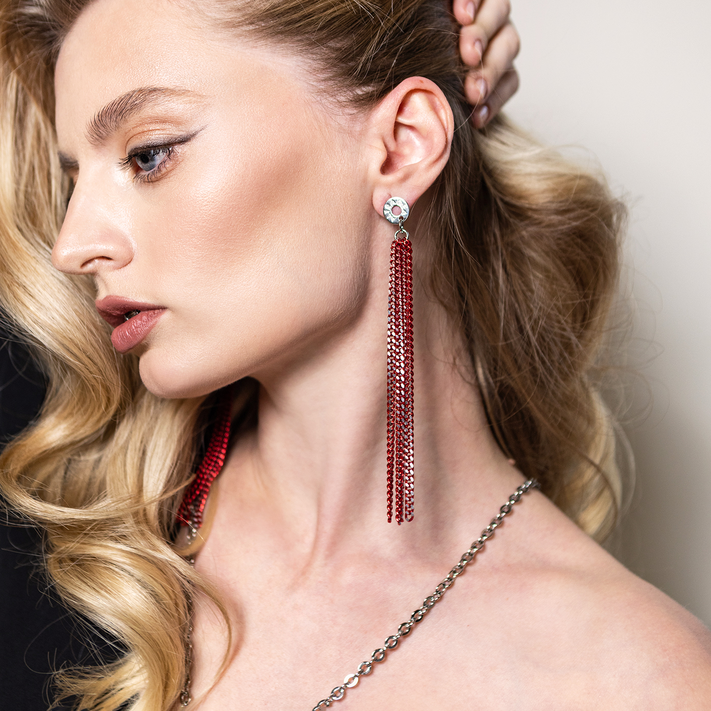 Eleganckie kolczyki wykonane z czerwonego łańcuszka ze srebrnym wykończeniem. To bardzo lekkie kolczyki, niezwykle wygodne podczas