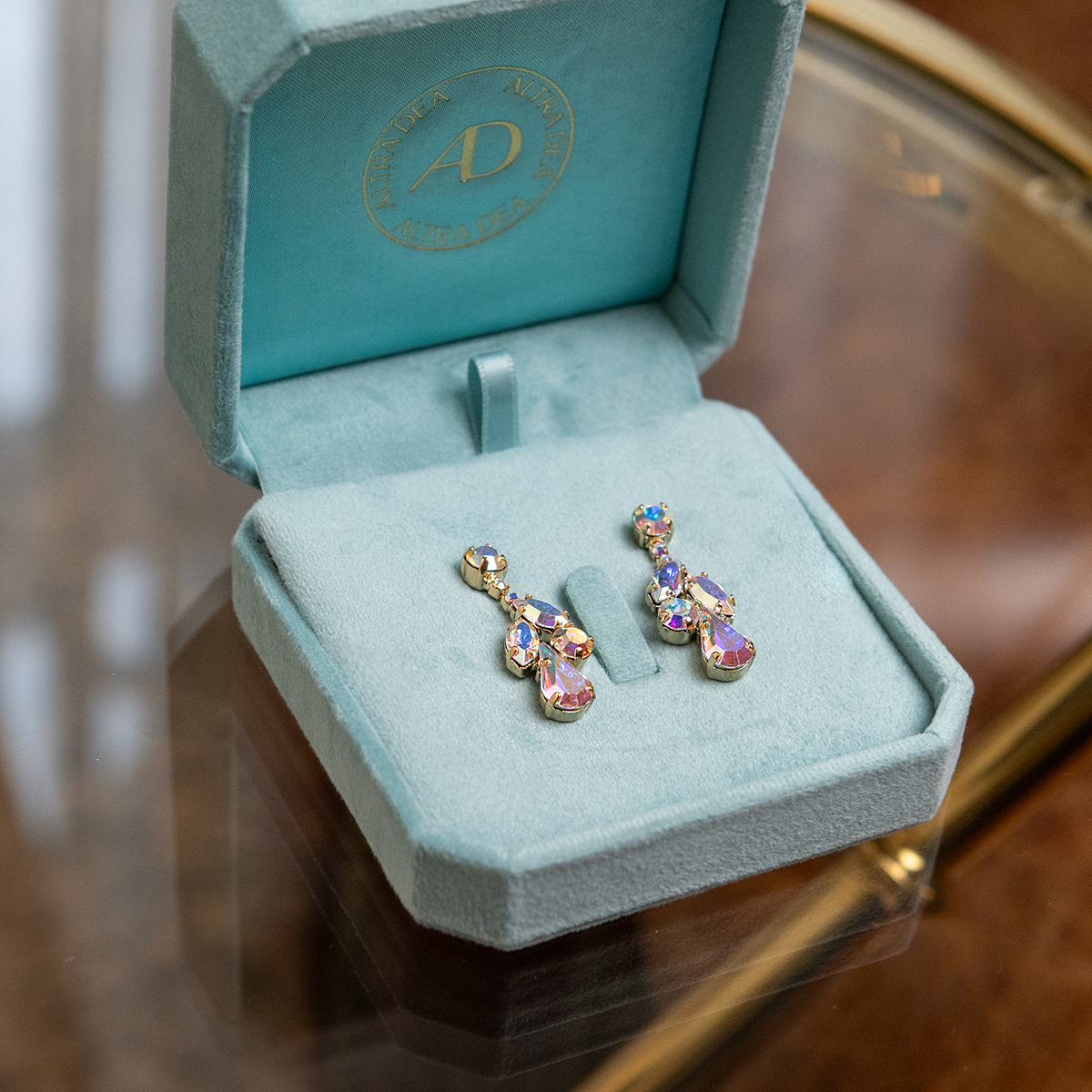Kolczyki Luna w złotej oprawie to biżuteria, która uwielbia wieczór i światło po zmroku. Kryształy Swarovski Aurora Boreale, osadzone w ciepłym złocie, tworzą efekt głębokiego, zmysłowego blasku, który zmienia się przy każdym ruchu.