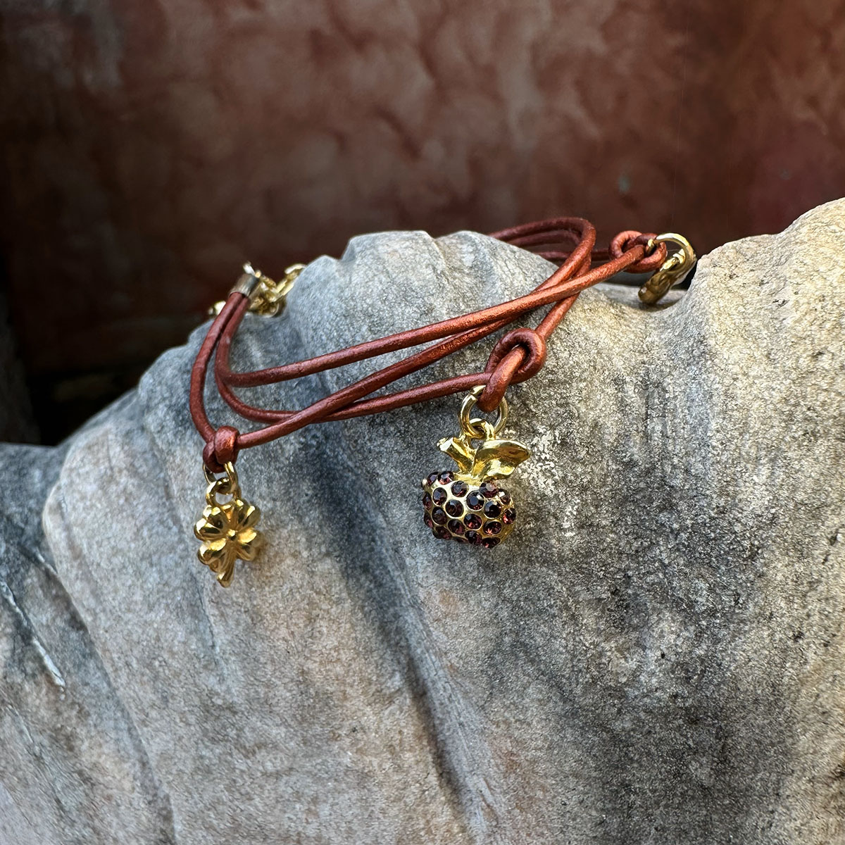 Bransoletka Fruttata – skórka w odcieniu marokańskiego brązu wpadającego w bordo, złote wykończenie, kryształy Swarovski w kolorze głębokiego bordo.