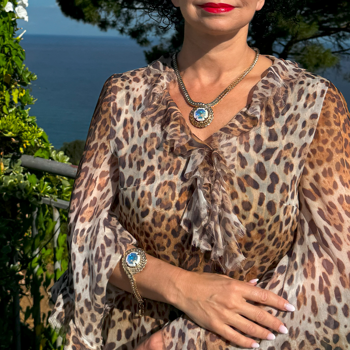 Wyrazisty naszyjnik i kryształ Swarovski w odcieniu Aurora Boreale tworzą duet, który błyszczy z charakterem – zmienia barwy w zależności od światła, przyciąga spojrzenia i nie pozwala przejść obojętnie.