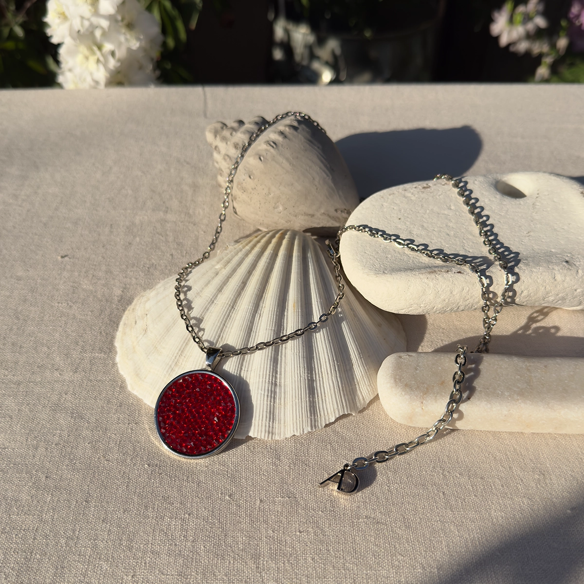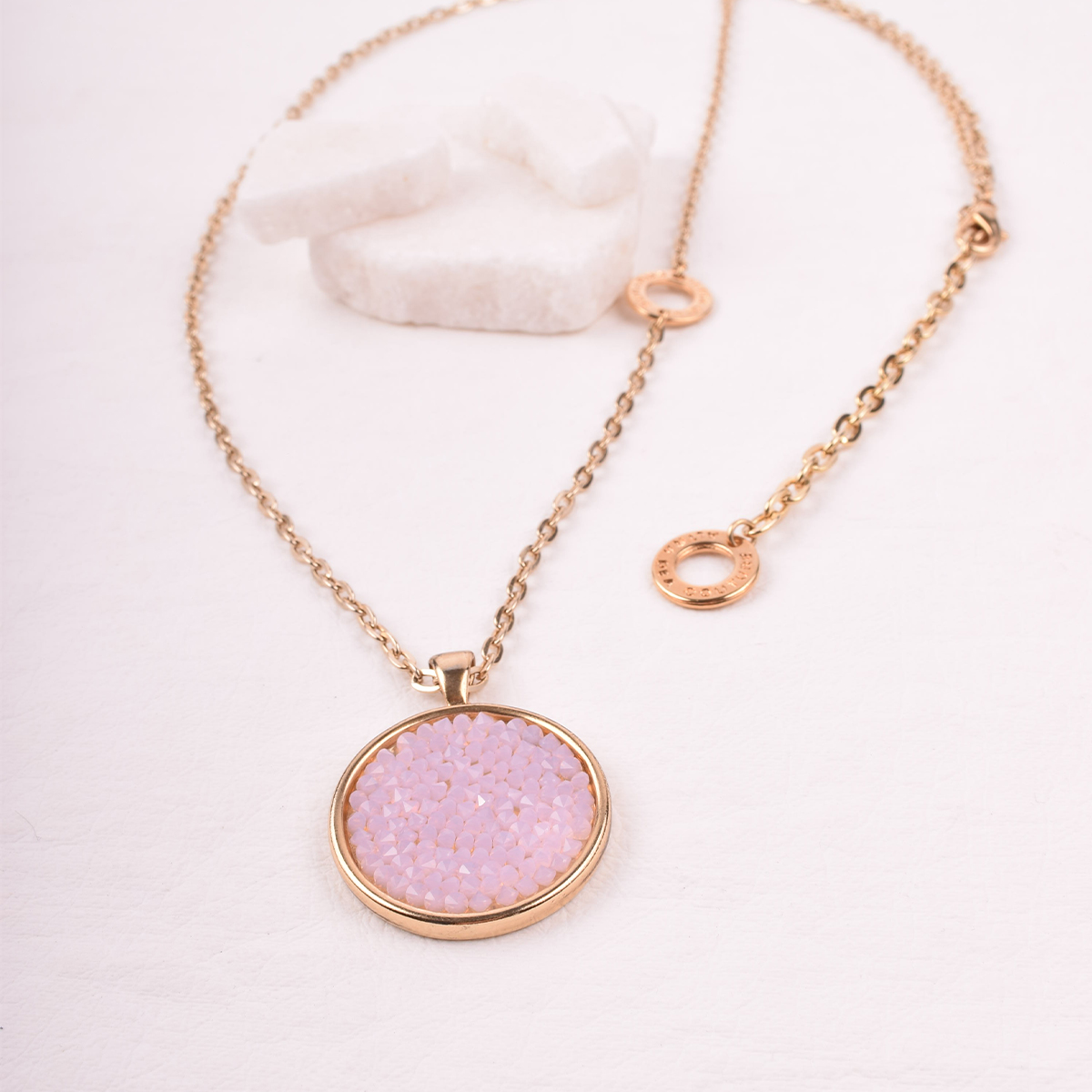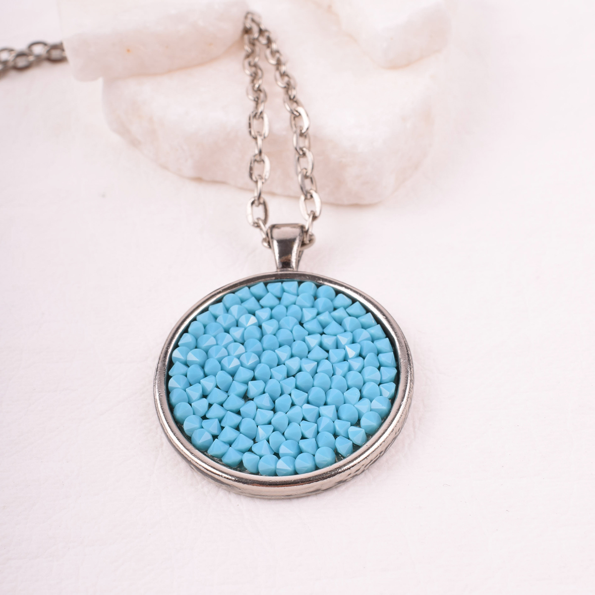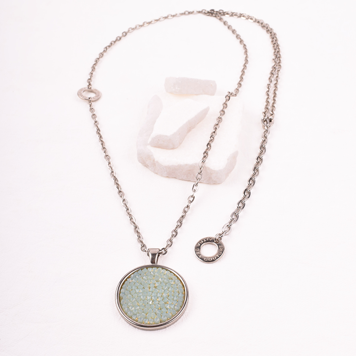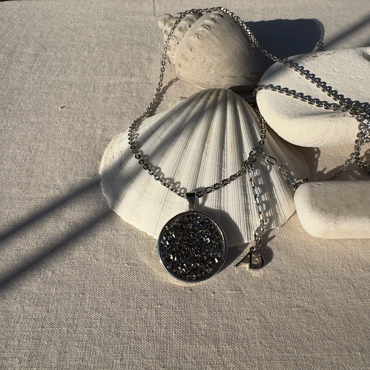Srebrny, długi naszyjnik z łańcuszkiem o prostych ogniwach. W centrum – okrągła zawieszka, lśniąca mozaika drobnych, ciemnych kryształów Swarovski. Ich ułożenie potęguje odbijanie światła, tworząc efekt spektakularnego blasku.