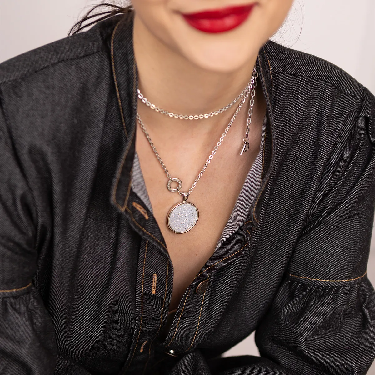 Srebrny, długi naszyjnik z łańcuszkiem o prostych ogniwach. W centrum – okrągła zawieszka typu medalion z lśniącą mozaiką drobnych, mlecznych kryształów Swarovski. Ich ułożenie potęguje odbijanie światła, tworząc efekt deliaktnego blasku.