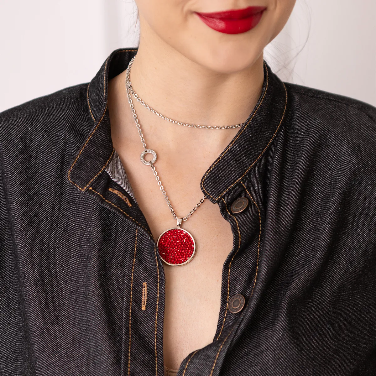 Srebrny, długi naszyjnik z łańcuszkiem o prostych ogniwach. W centrum – okrągła zawieszka, lśniąca mozaika drobnych, czerwonych kryształów Swarovski. Ich ułożenie potęguje odbijanie światła, tworząc efekt spektakularnego blasku.