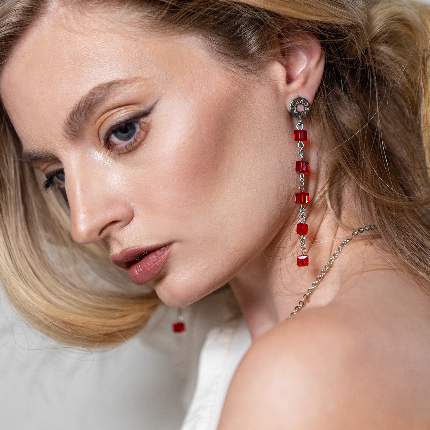 i pięciu czerwonych, połyskujących kryształów Swarovski. Optycznie wydłużają szyję i wysmuklają twarz oraz dodają jej blasku.