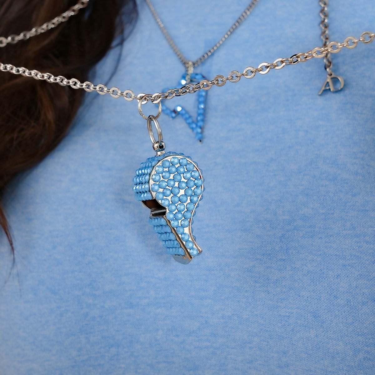 Długi naszyjnik w kolorze srebrnym z profesjonalnym gwizdkiem* sportowym.