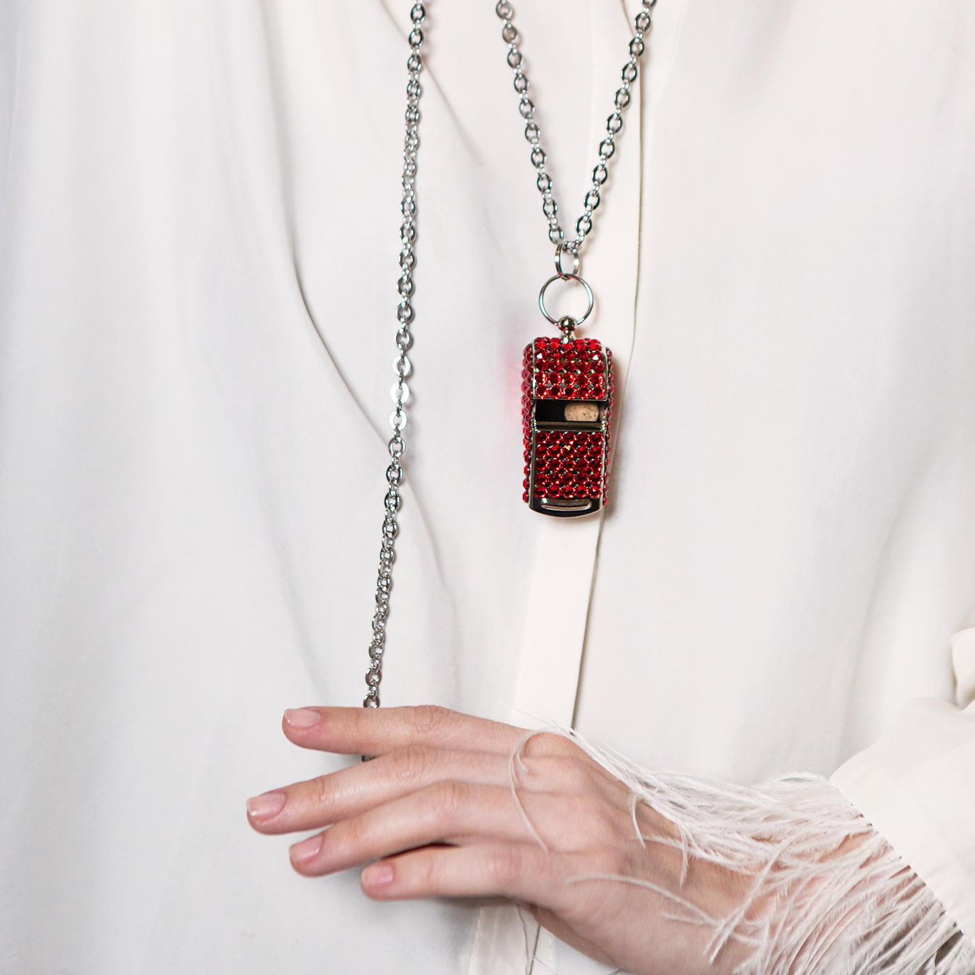Długi naszyjnik w kolorze srebrnym, z profesjonalnym gwizdkiem* w efektownej odsłonie. Sto dziewięćdziesiąt osiem czerwonych kryształów niezwykle efektownie odbija światło, dodając stylizacji blasku. Można go nosić w wersji długiej lub zapinać na dowolne oczko łańcuszka, regulując długość według własnych preferencji.