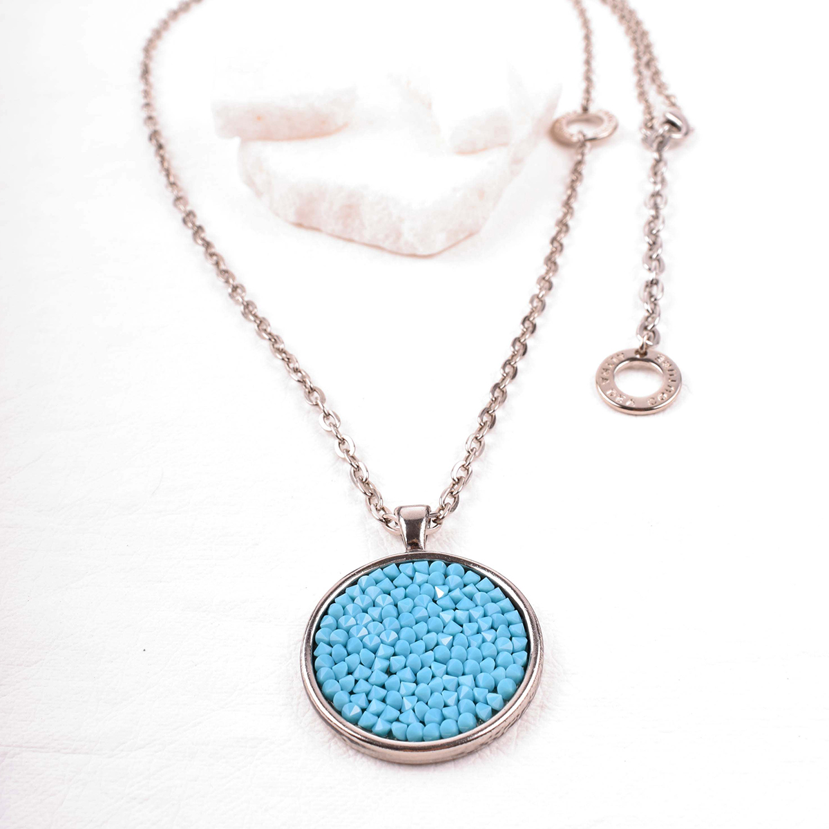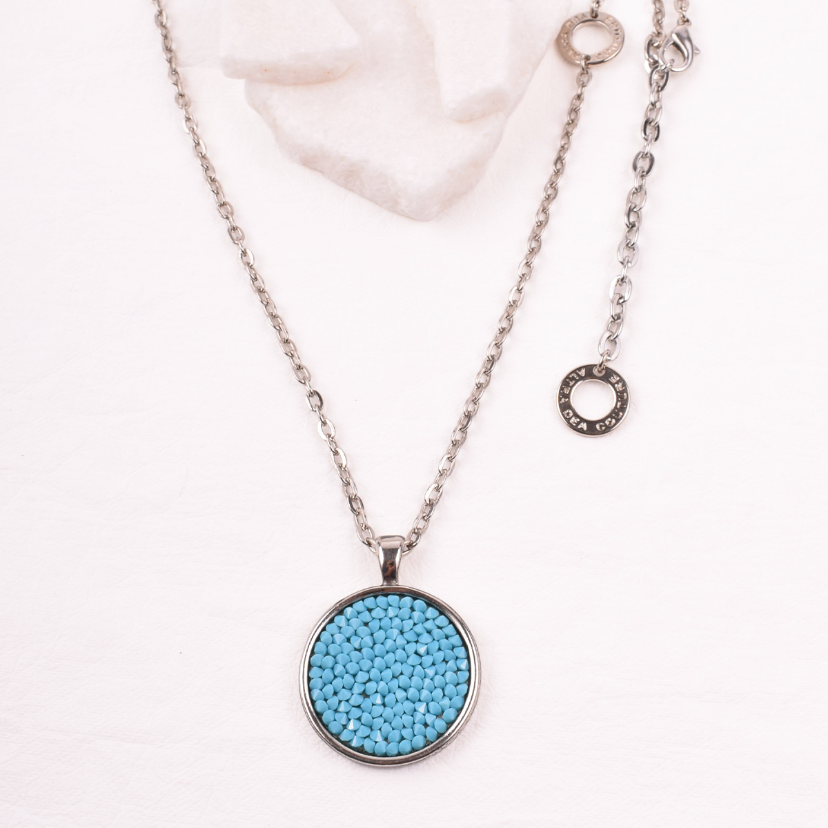 Srebrny, długi naszyjnik z łańcuszkiem o prostych ogniwach. W centrum – okrągła zawieszka, lśniąca mozaika drobnych, niebieskich kryształów Swarovski. Ich ułożenie potęguje odbijanie światła, tworząc efekt spektakularnego blasku.