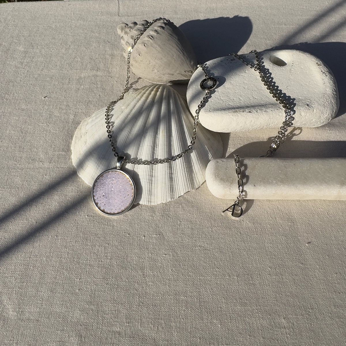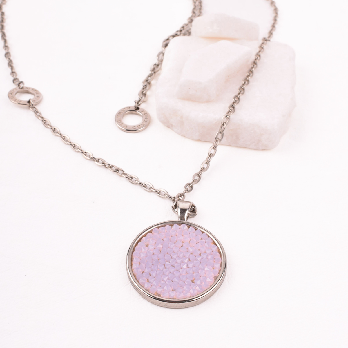 Srebrny, długi naszyjnik z łańcuszkiem o prostych ogniwach. W centrum – okrągła zawieszka, lśniąca mozaika drobnych, różowych kryształów Swarovski.Ich ułożenie potęguje odbijanie światła, tworząc efekt spektakularnego blasku.