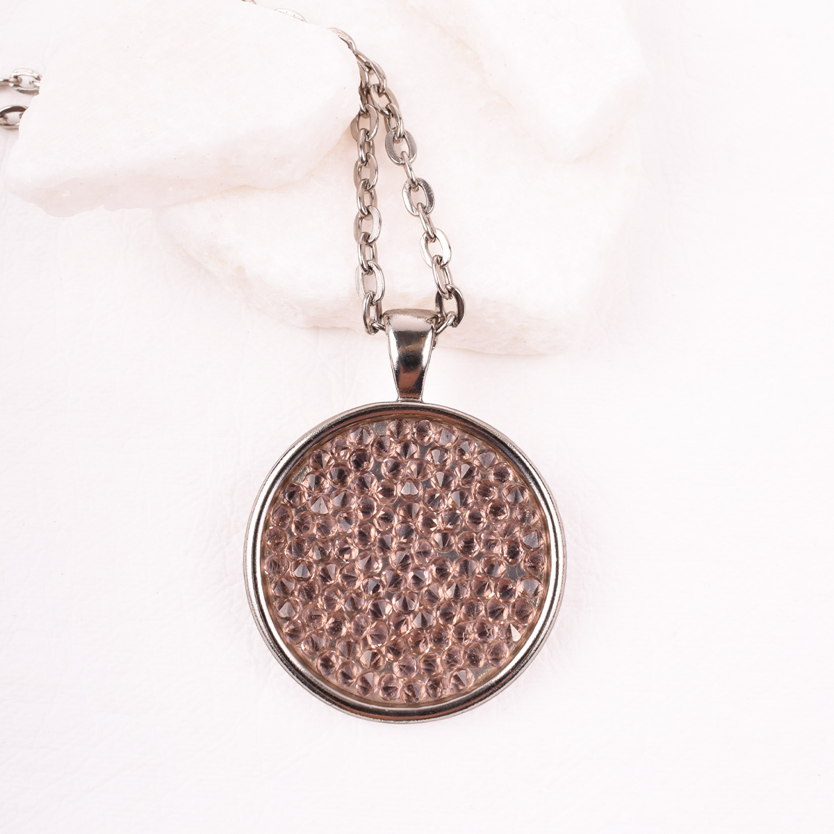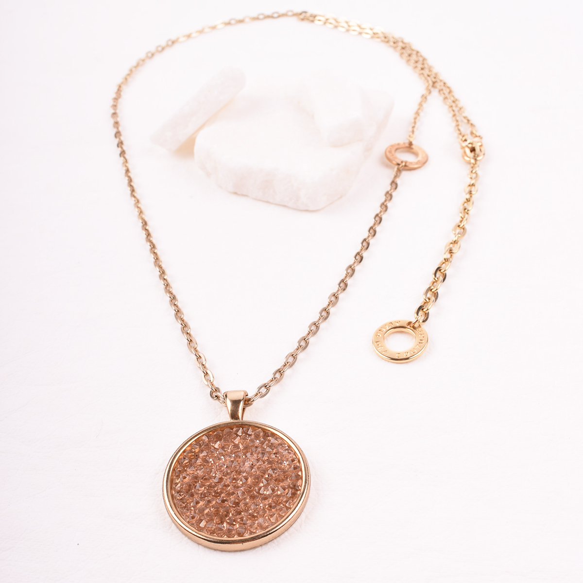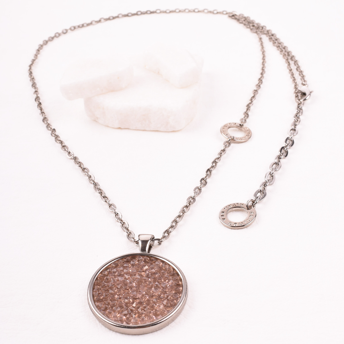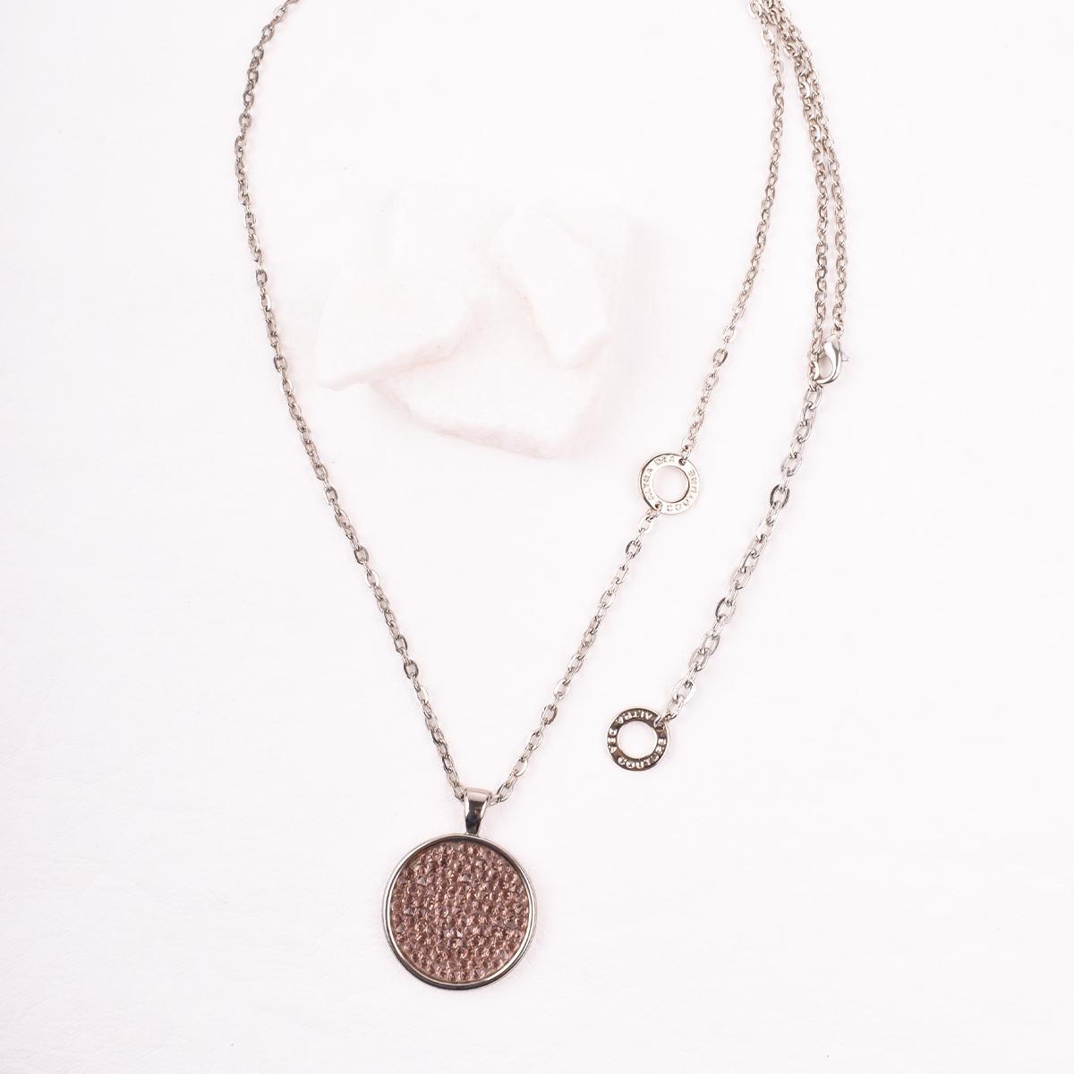Srebrny, długi naszyjnik z łańcuszkiem o prostych ogniwach. W centrum – okrągła zawieszka, lśniąca mozaika drobnych, herbacianych kryształów Swarovski. Ich ułożenie potęguje odbijanie światła, tworząc efekt spektakularnego blasku.
