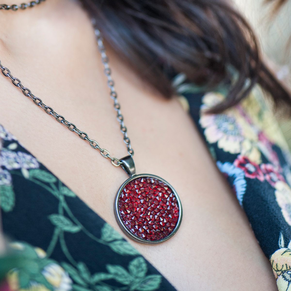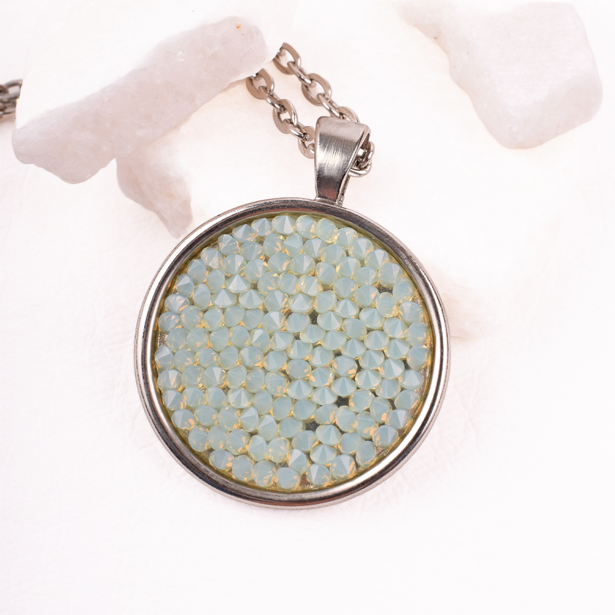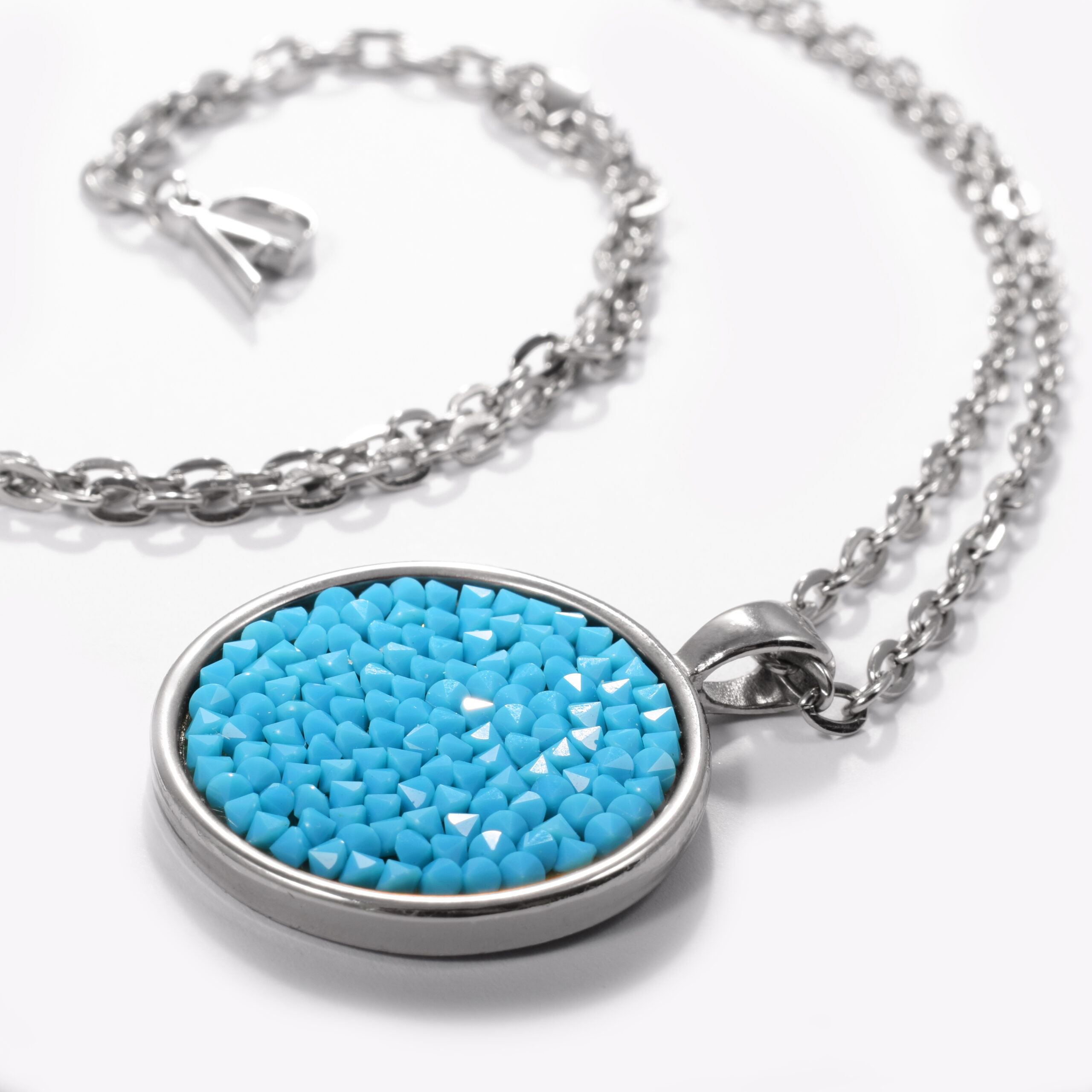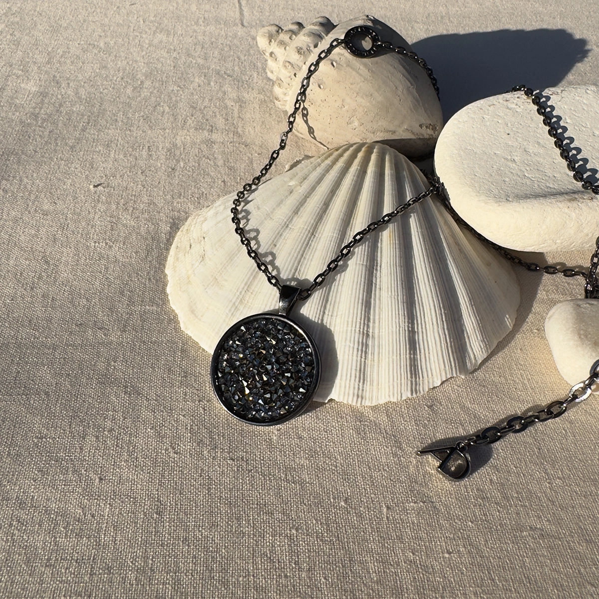 Srebrny, długi naszyjnik z łańcuszkiem o prostych ogniwach. W centrum – okrągła zawieszka, lśniąca mozaika drobnych, herbacianych kryształów Swarovski. Ich ułożenie potęguje odbijanie światła, tworząc efekt spektakularnego blasku.