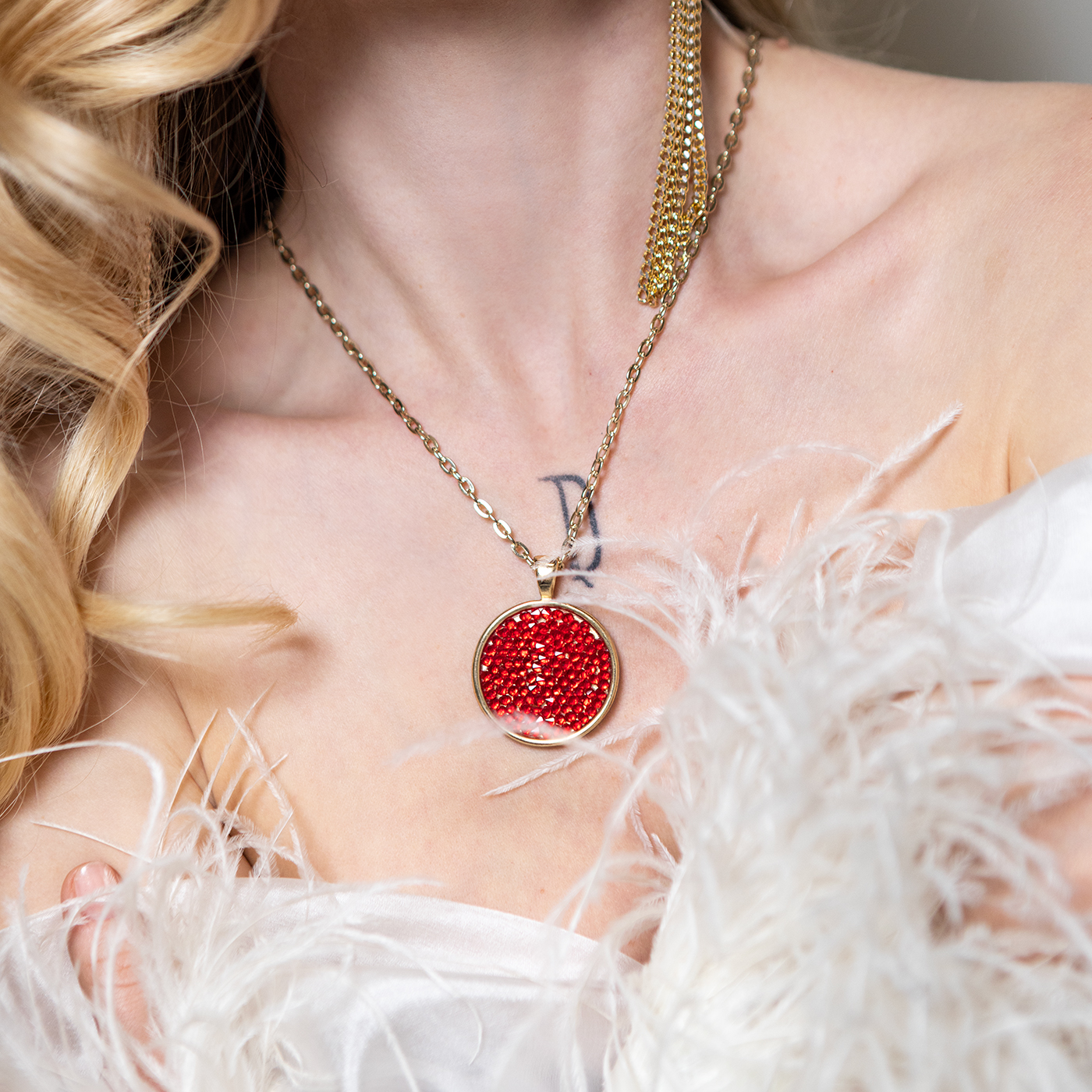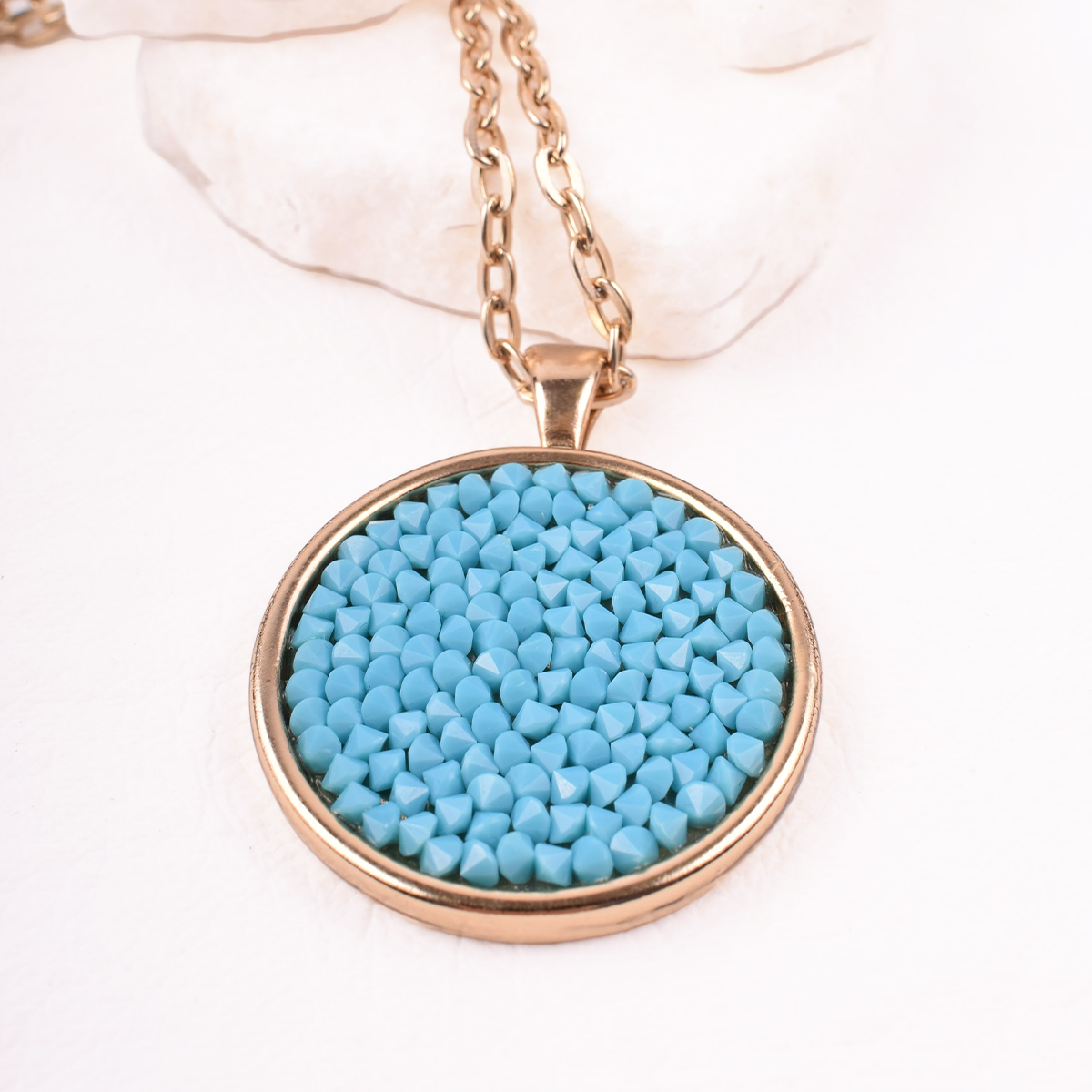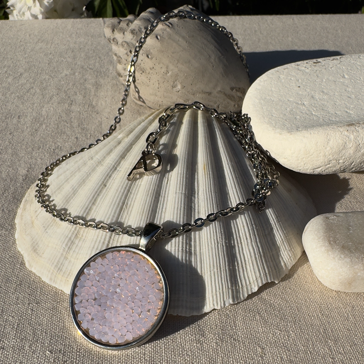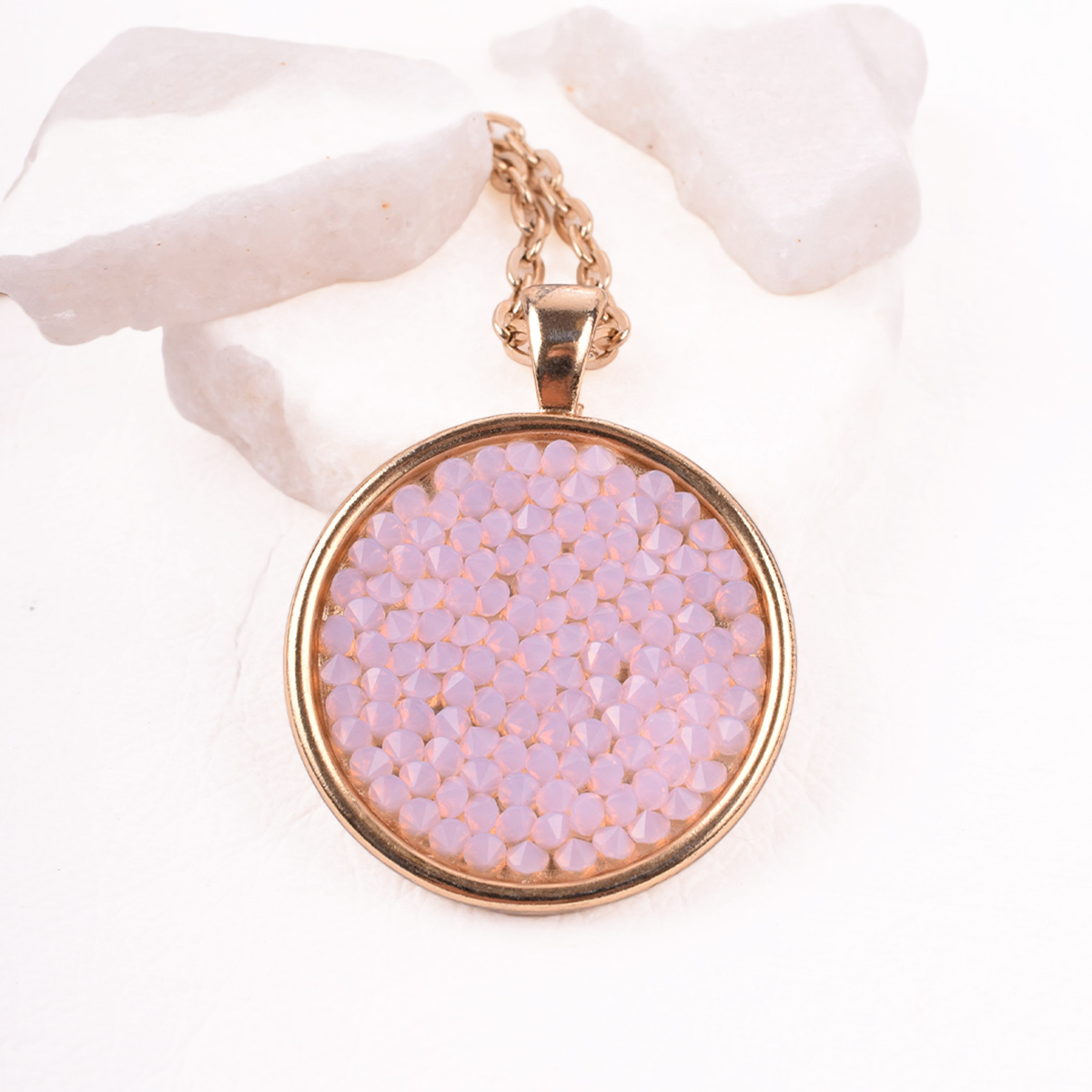 Srebrny, długi naszyjnik z łańcuszkiem o prostych ogniwach. W centrum – okrągła zawieszka, lśniąca mozaika drobnych, herbacianych kryształów Swarovski. Ich ułożenie potęguje odbijanie światła, tworząc efekt spektakularnego blasku.