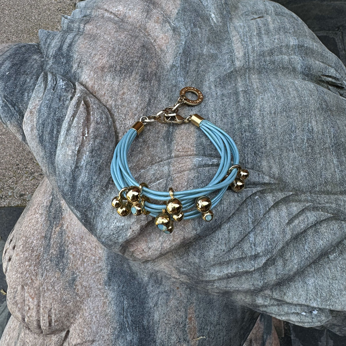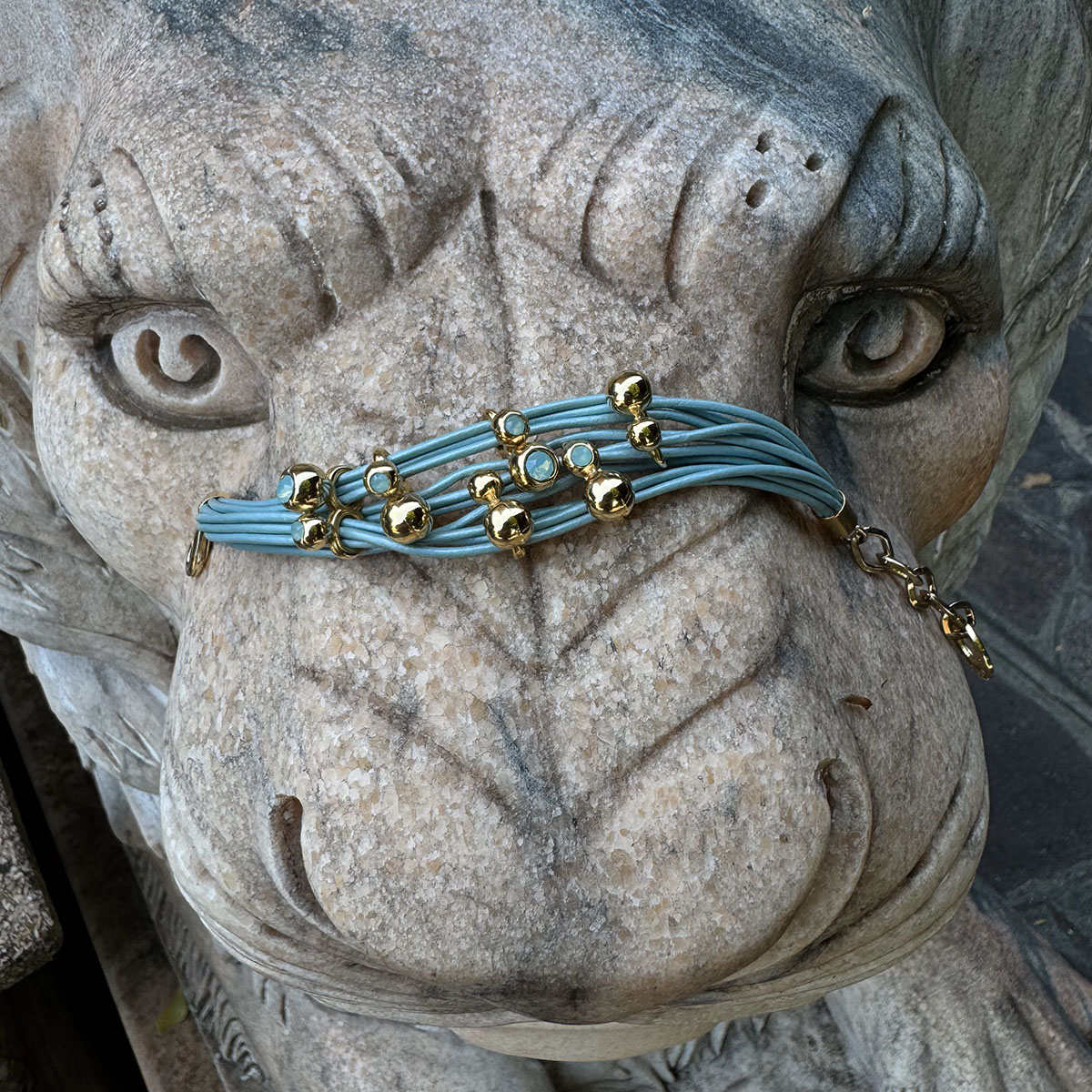 Delikatna, świeża i lekko figlarna. Turkusowa skórka i złote wykończenie w towarzystwie kryształów Swarovski tworzą bransoletkę, którą pokochasz od pierwszego założenia.