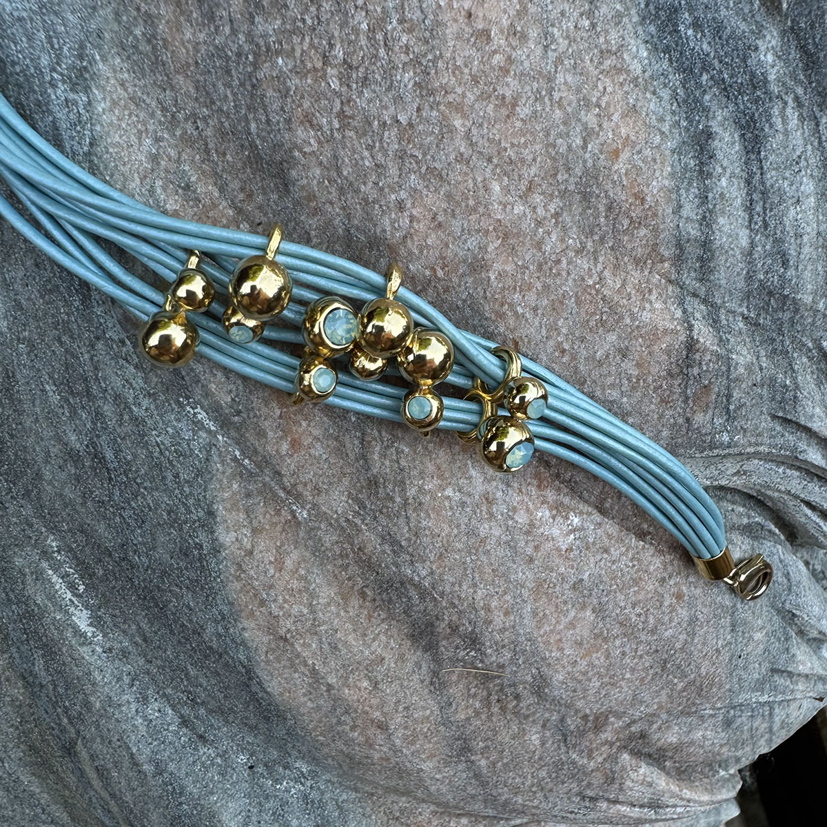 Bransoletka Brio – Turkusowa skórka, złote wykończenie, 6 turkusowych kryształów Swarovski