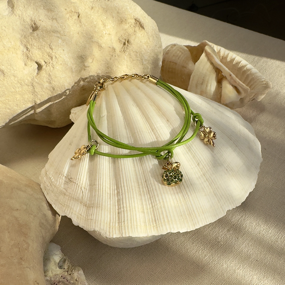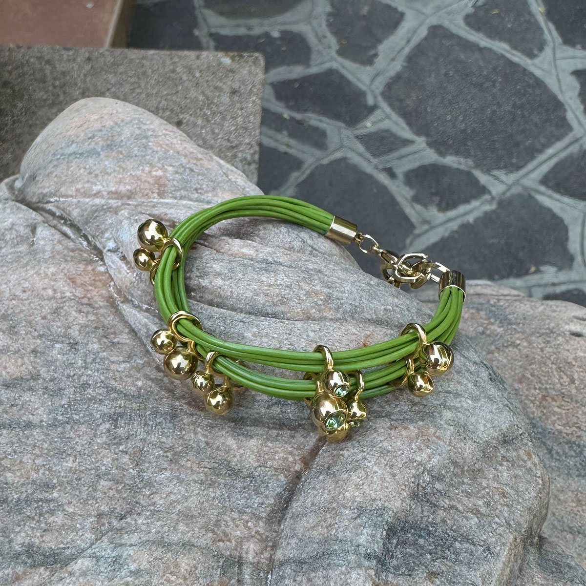 Zielona bransoletka z zamszowej skóry, podwójnie owijana wokół nadgarstka. Minimalistyczne, złote zapięcie podkreśla jej wyrafinowaną prostotę.