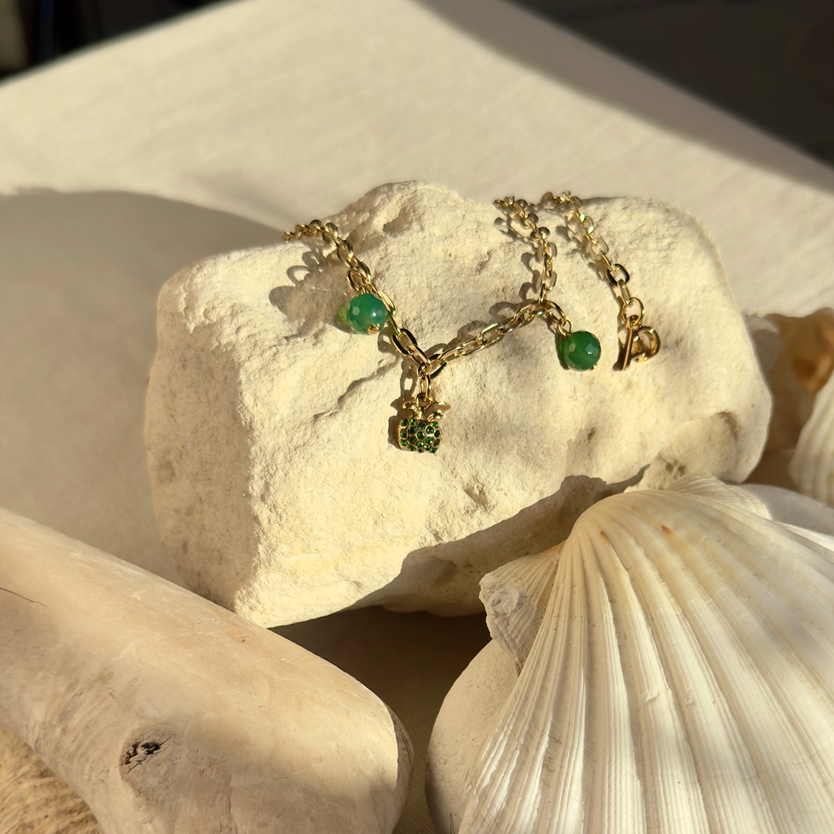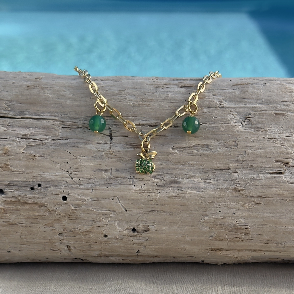 Naszyjnik z zawieszką w kształcie jabłuszka wysadzaną ponad 20 zielonymi kryształami Swarovski oraz dwoma kamieniami zielonego agatu.