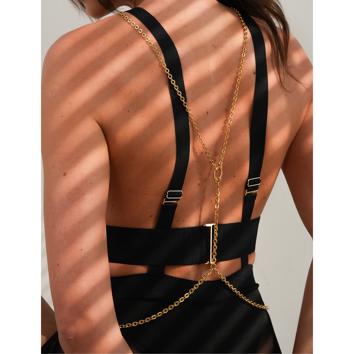 Złoty łańcuszek na ciało z wyrazistym charakterem. Nasz bodychain świetnie wygląda założony na ubranie, jak i noszony bezpośrednio na ciele. Ten dodatek nada każdej stylizacji zupełnie nowego charakteru.