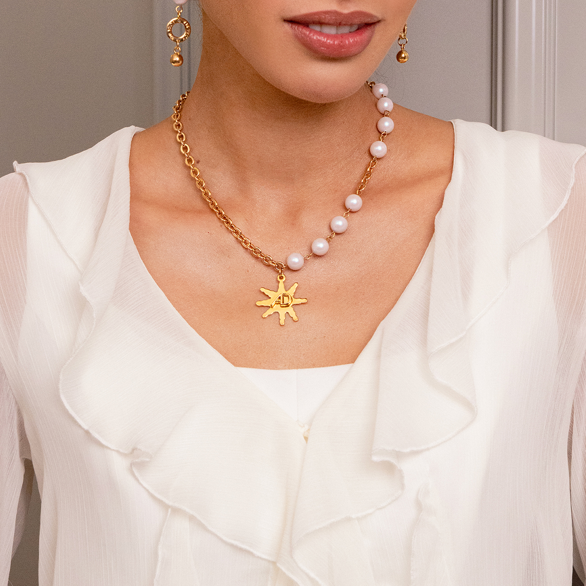Elegancki, złoty naszyjnik z perłami Swarovski opalizującymi na różowo. Wykonany jest z łańcuszka o płaskich oczkach. Ręcznie obrabiana zawieszka