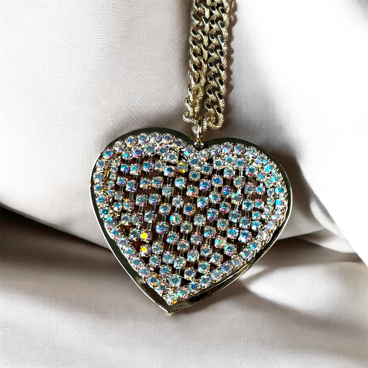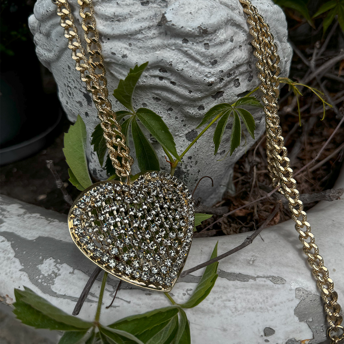 Złoty, długi naszyjnik z ozdobnym łańcuszkiem, który prowadzi wzrok wprost do serca. Okazała zawieszka w jego kształcie została wysadzona 135 kryształami Swarovski w odcieniu Black Diamond.