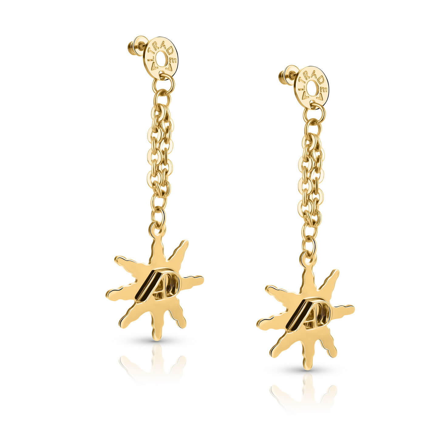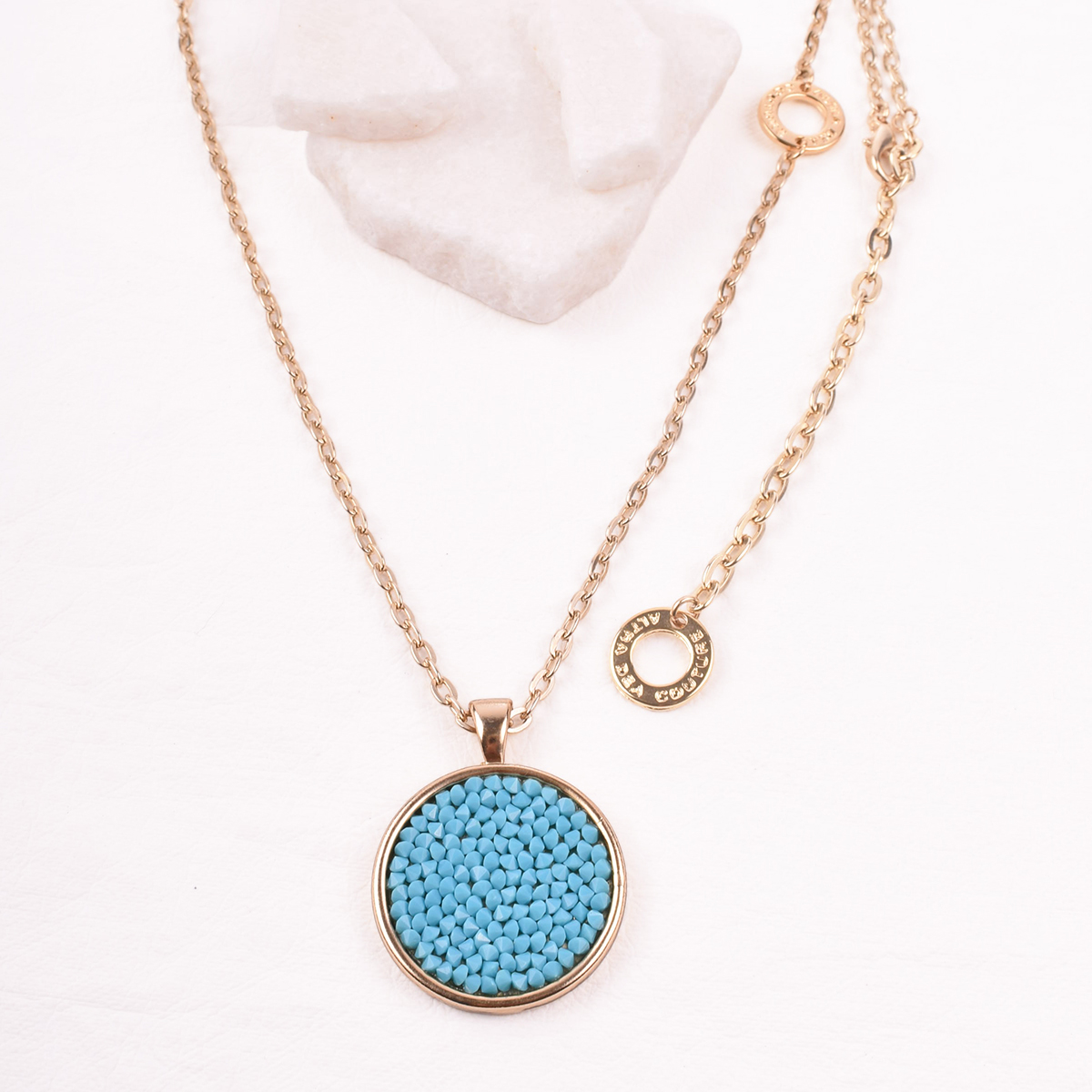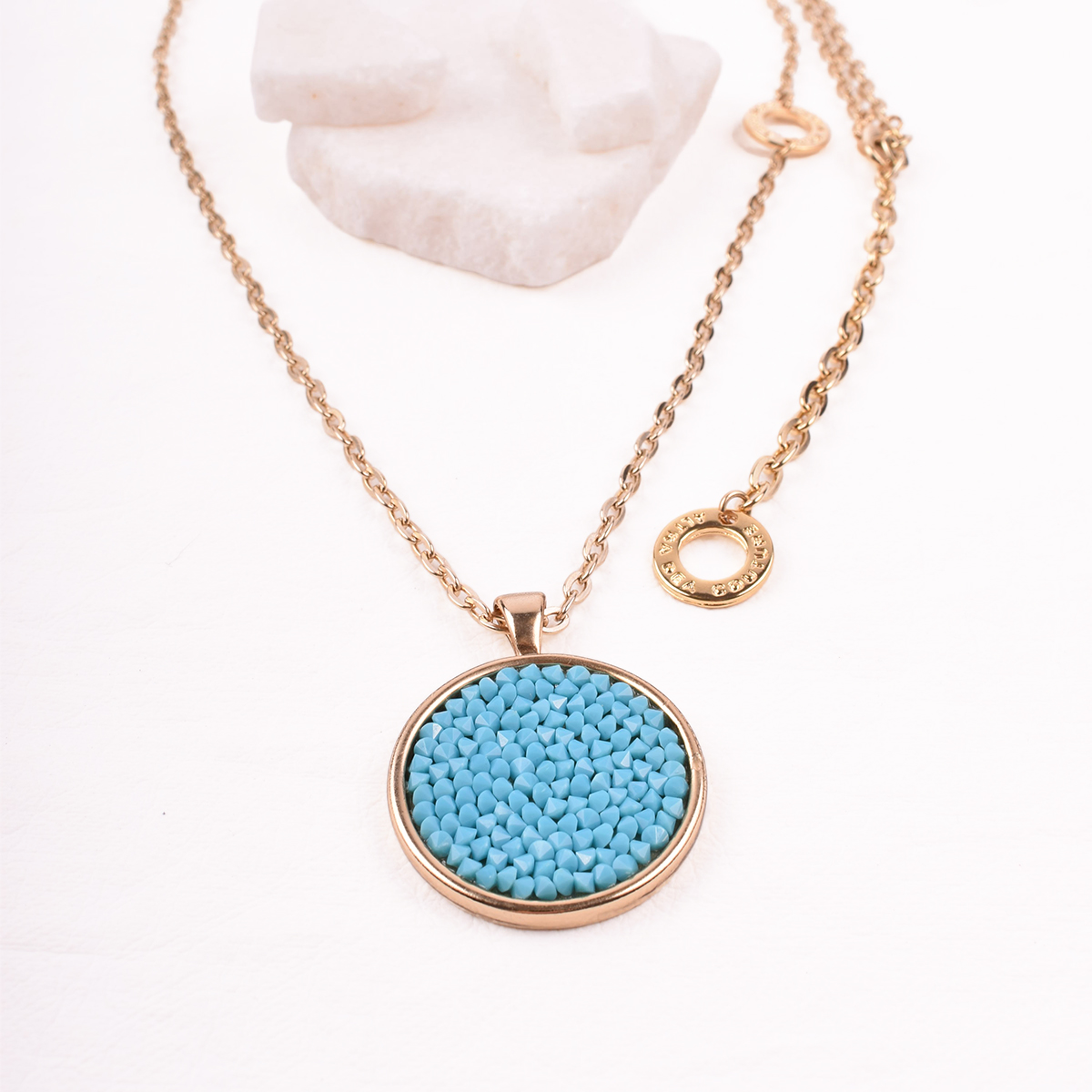 Długi naszyjnik z łańcuszkiem w kolorze złotym o prostych ogniwach. W centrum – okrągła zawieszka, lśniąca mozaika drobnych, niebieskich kryształów Swarovski. Ich ułożenie potęguje odbijanie światła, tworząc efekt spektakularnego blasku.
