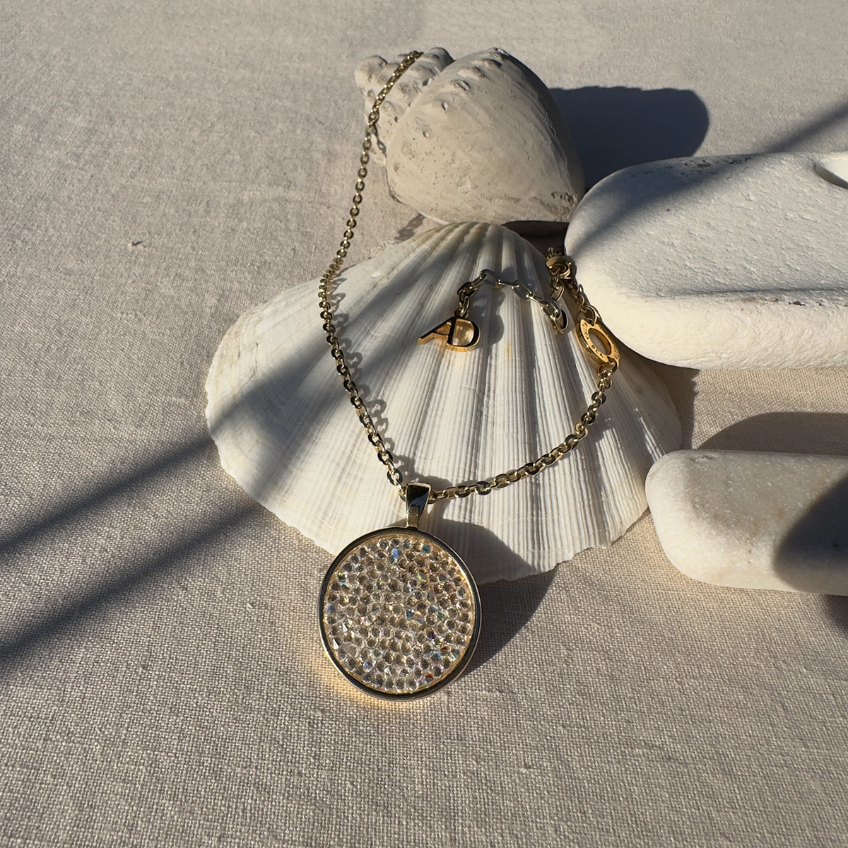 Długi naszyjnik z łańcuszkiem w kolorze złotym o prostych ogniwach. W centrum – okrągła zawieszka, lśniąca mozaika drobnych, przezroczystych kryształów Swarovski. Ich ułożenie potęguje odbijanie światła, tworząc efekt spektakularnego blasku.