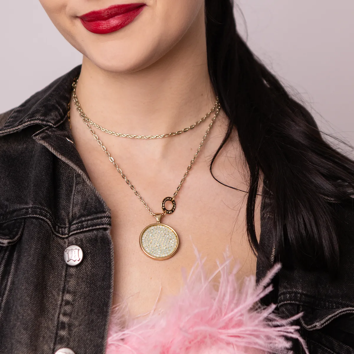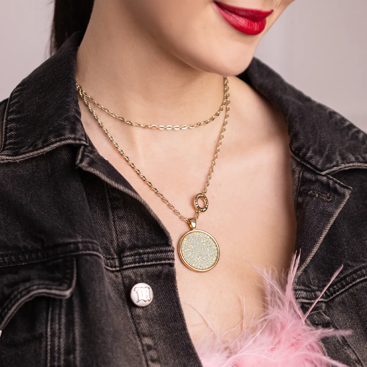 Długi naszyjnik w kolorze złota z łańcuszkiem o prostych ogniwach. W centrum – okrągła zawieszka, lśniąca mozaika drobnych, miętowych kryształów Swarovski. Ich ułożenie potęguje odbijanie światła, tworząc efekt spektakularnego blasku.