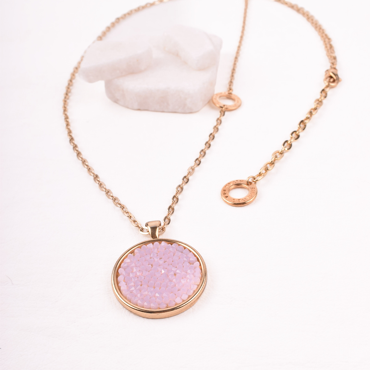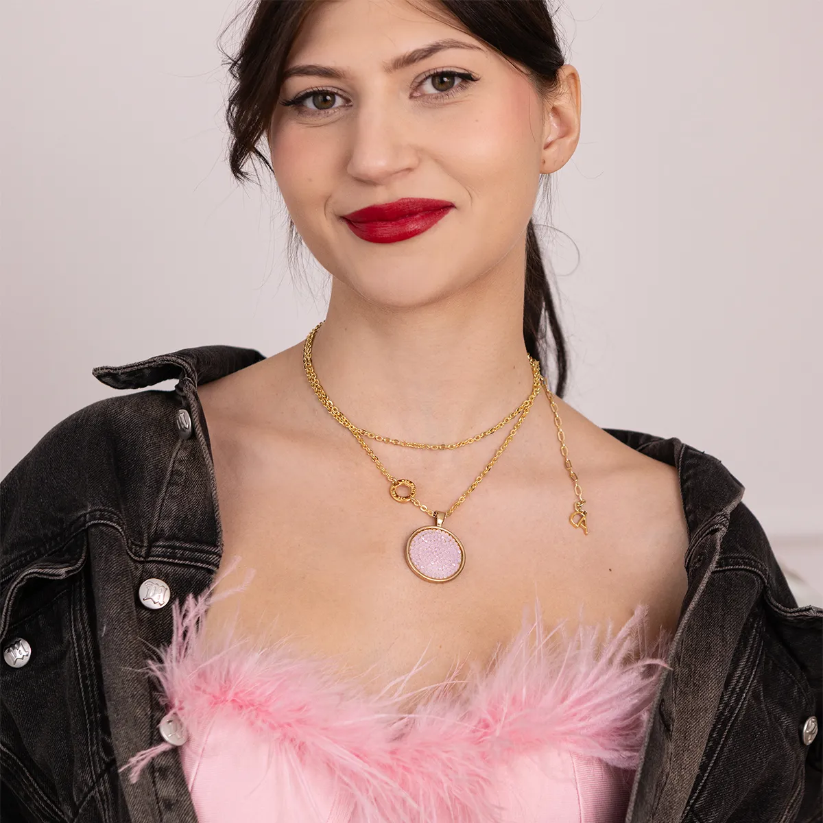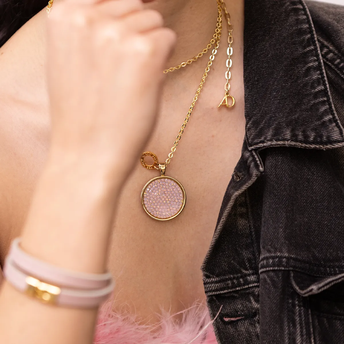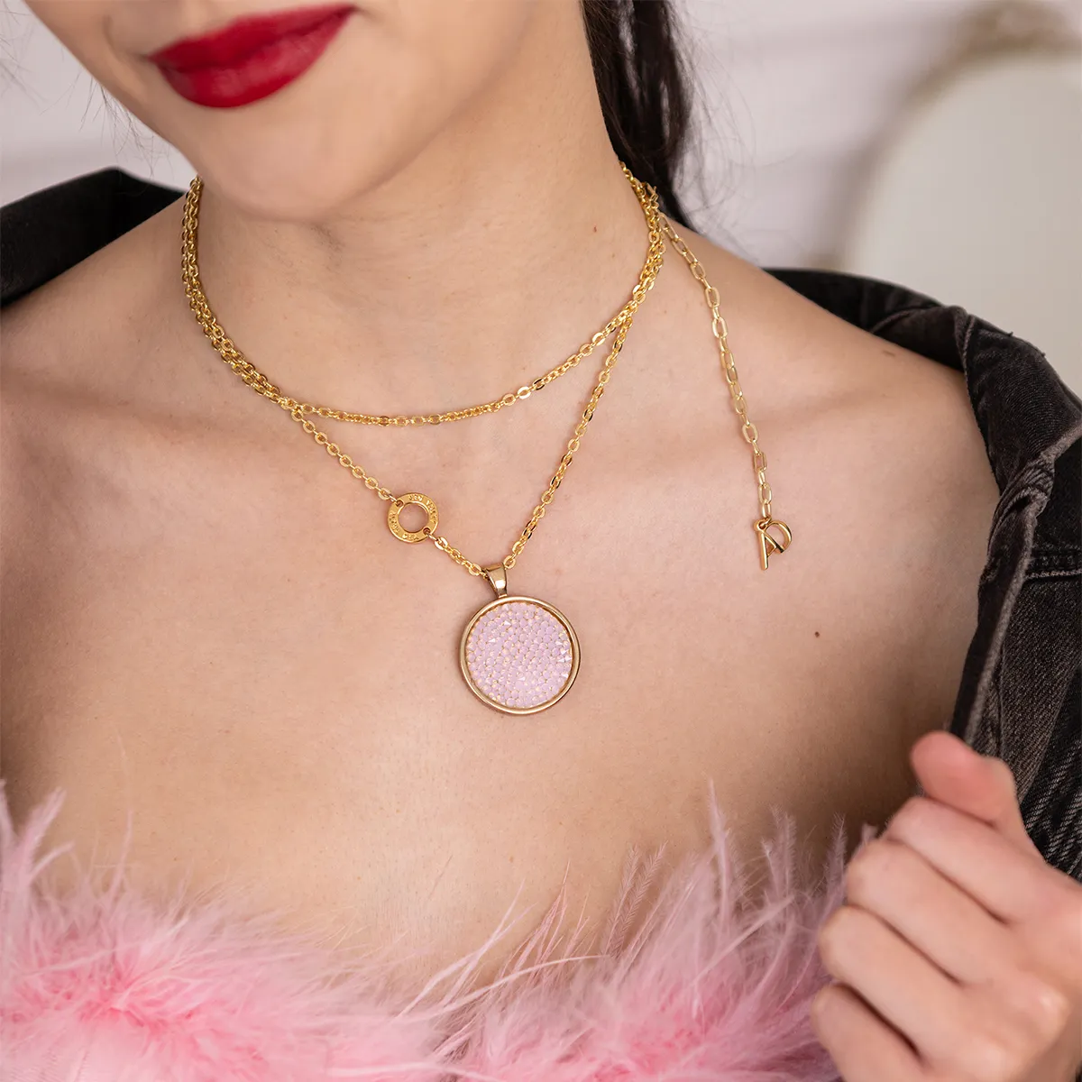 Długi naszyjnik z łańcuszkiem w kolorze złotym o prostych ogniwach. W centrum – okrągła zawieszka, lśniąca mozaika drobnych, różowych kryształów Swarovski. Ich ułożenie potęguje odbijanie światła, tworząc efekt spektakularnego blasku.