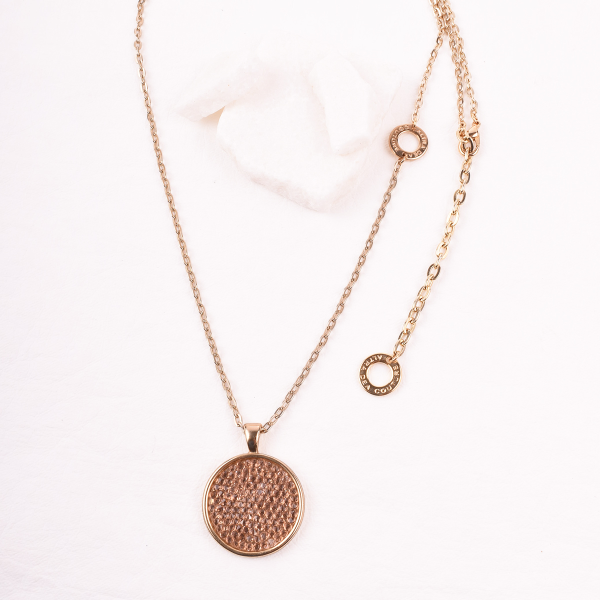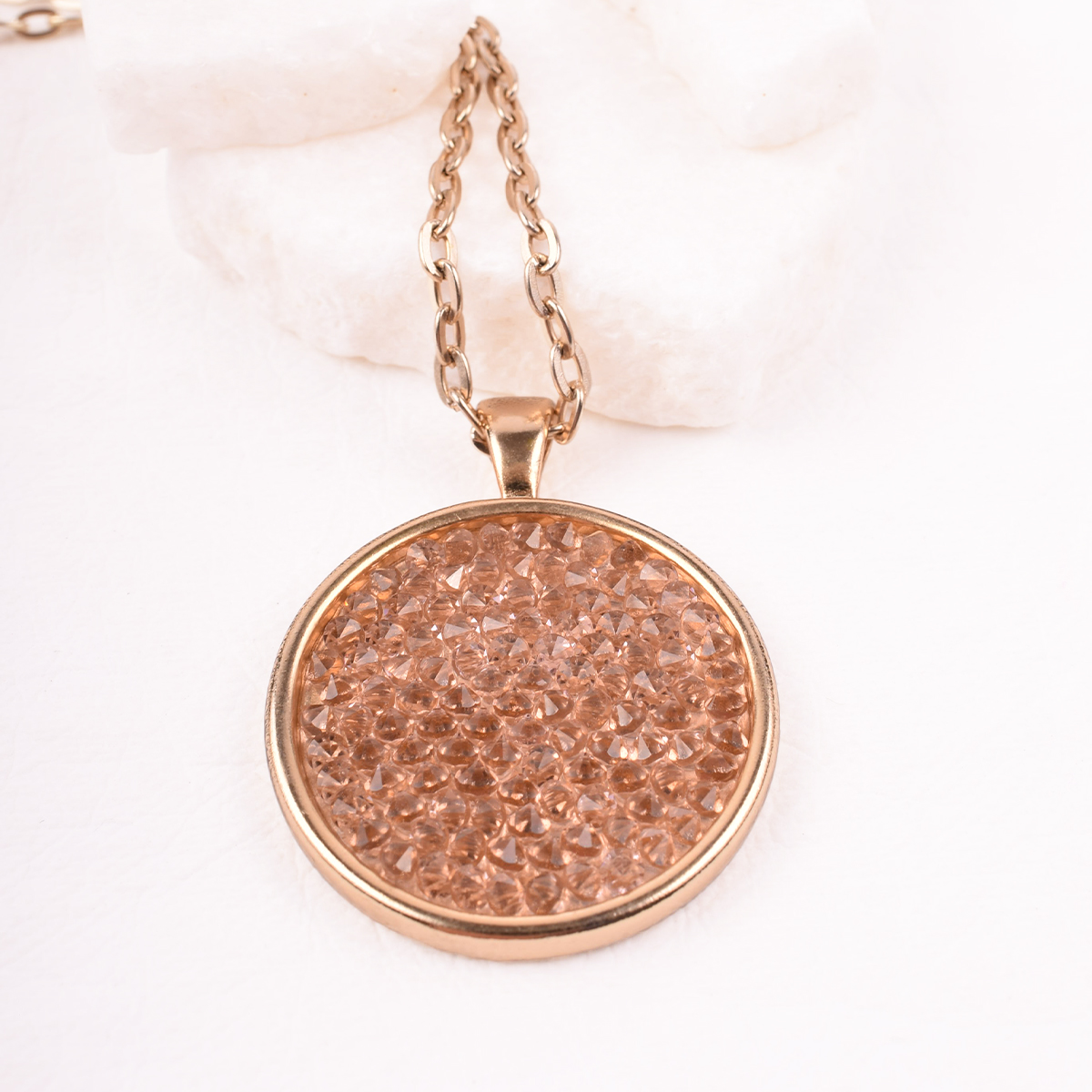 Długi naszyjnik z łańcuszkiem w kolorze złotym o prostych ogniwach. W centrum – okrągła zawieszka, lśniąca mozaika drobnych, herbacianych kryształów Swarovski. Ich ułożenie potęguje odbijanie światła, tworząc efekt spektakularnego blasku.